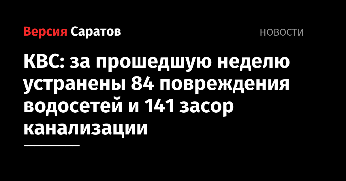 С 29 мая по 5 июня специалисты ООО «КВС» устранили 84 повреждения городских водопроводных коммуникаций. В 14 случаях для проведения работ было необходимо временно ограничивать холодное водоснабжение потребителей. 21 повреждение произошло на трубах малого диаметра (менее 100 мм). 54 течи устранены на водоводах от d100 до d300 мм (в основном — внутридворовые, внутриквартальные сети), 9 повреждений ликвидированы на трубопроводах диаметром больше 300 мм. За неделю отремонтированы 2 пожарных гидранта и 1 водоразборная колонка.