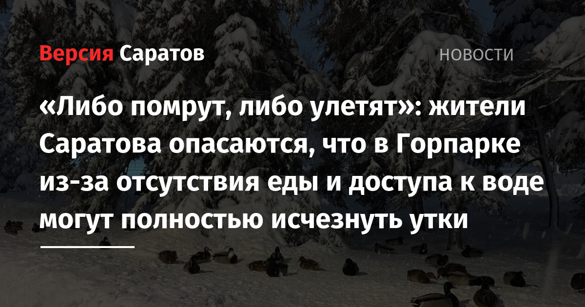 Саратовцы обеспокоены тем, что, из-за отсутствия нужных условий зимой, утки, живущие в Городском парке, могут покинуть его или вовсе умереть от голода. Напомним, с августа 2025 года эта зелёная территория перешла под управление мэрии Саратова, а до этого десятилетия обслуживалась за счёт предпринимателей. О птицах, единственным пристанищем которых стали сугробы, редакции ИА «Версия-Саратов» сообщила читательница.