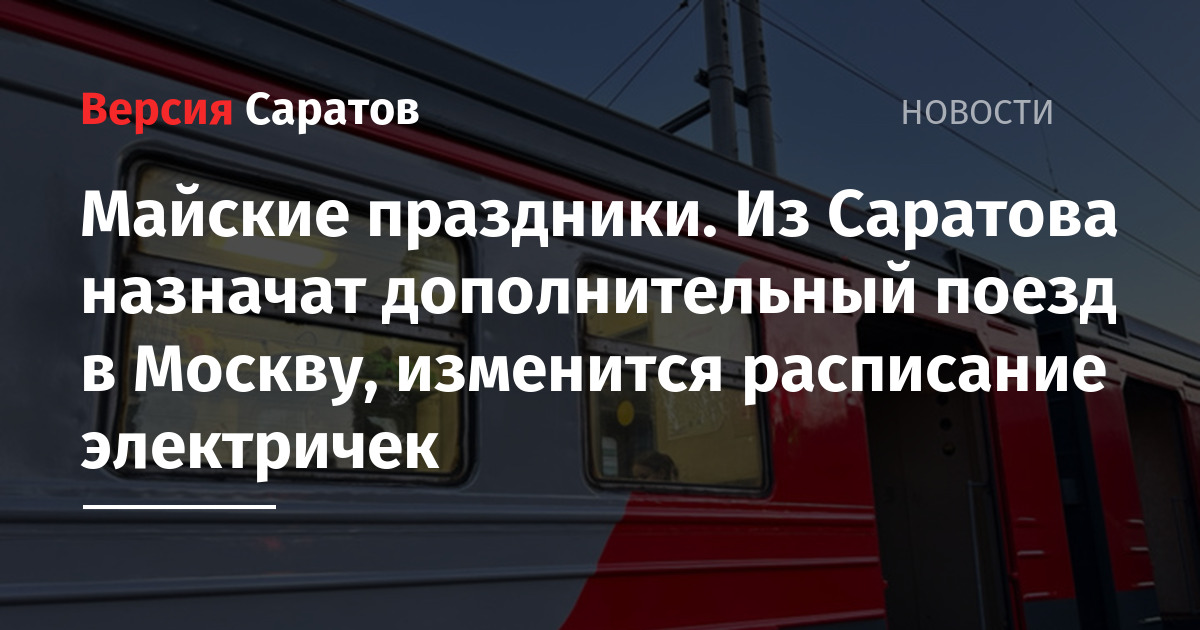 В ПривЖД рассказали, что будут назначены поезда в Москву. Поезд № 533/534 «Саратов — Москва» будет отправляться из Саратова 29 апреля, 3, 7, 10, 11 мая в 6:35 и прибывать в столицу на следующие сутки в 3:50. Из Москвы поезд будет отправляться 30 апреля, 4, 8, 11, 12 мая в 14:15 и прибывать в Саратов на следующие сутки в 8:00.