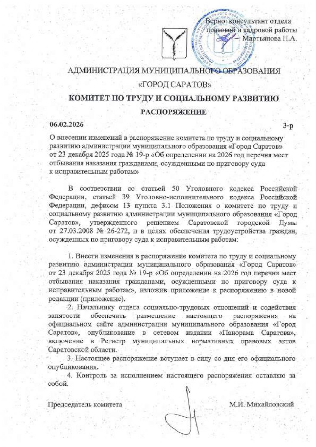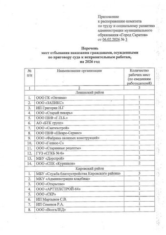 В Саратове изменен перечень мест отбывания наказания гражданам, осужденным по приговору суда к исправительным работам на 2026 год. Распоряжение комитета по труду и социальному развитию мэрии, которое вносит изменения в изначальный документ, подписанный в декабре прошлого года, опубликовано сегодня.