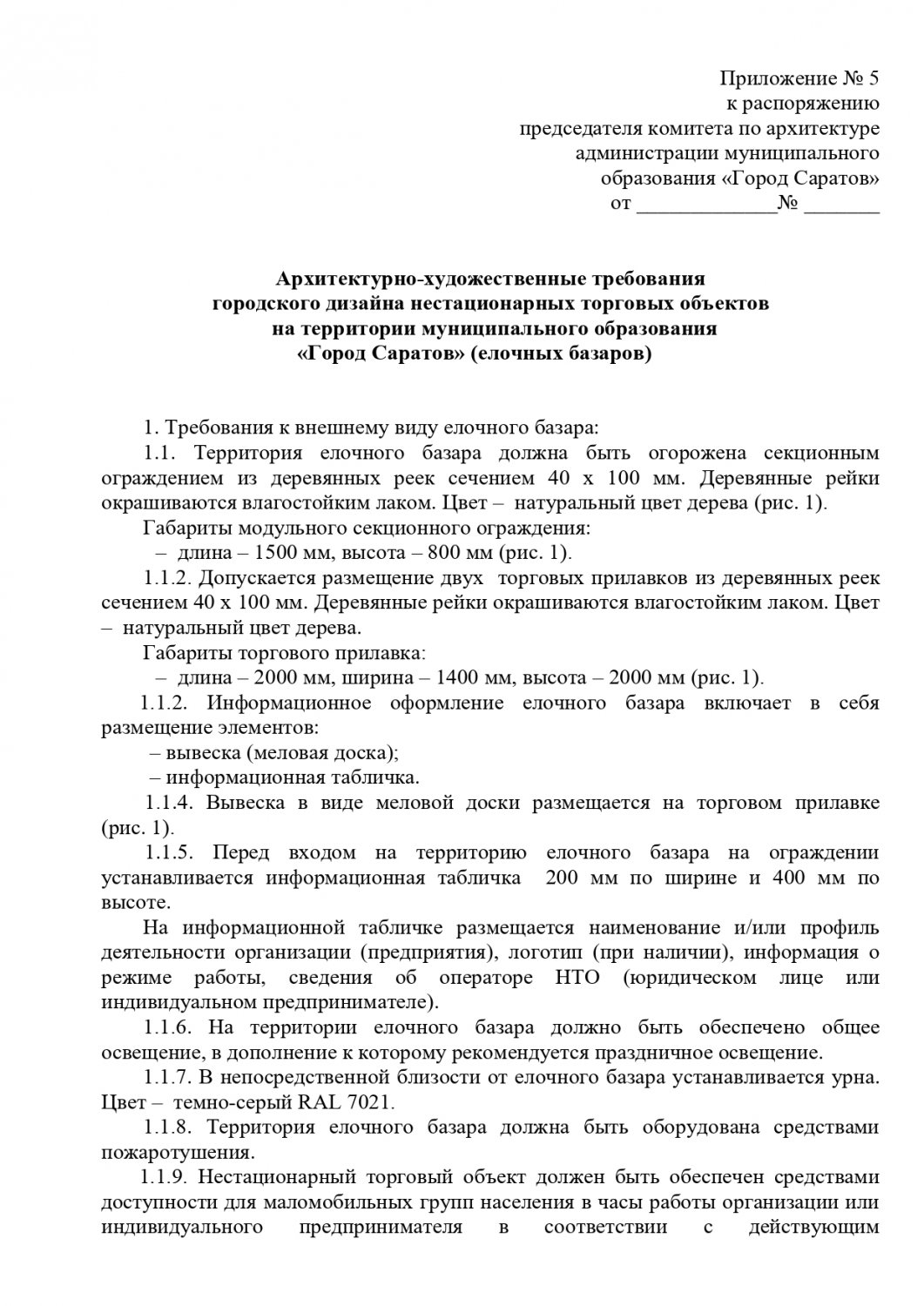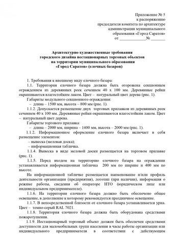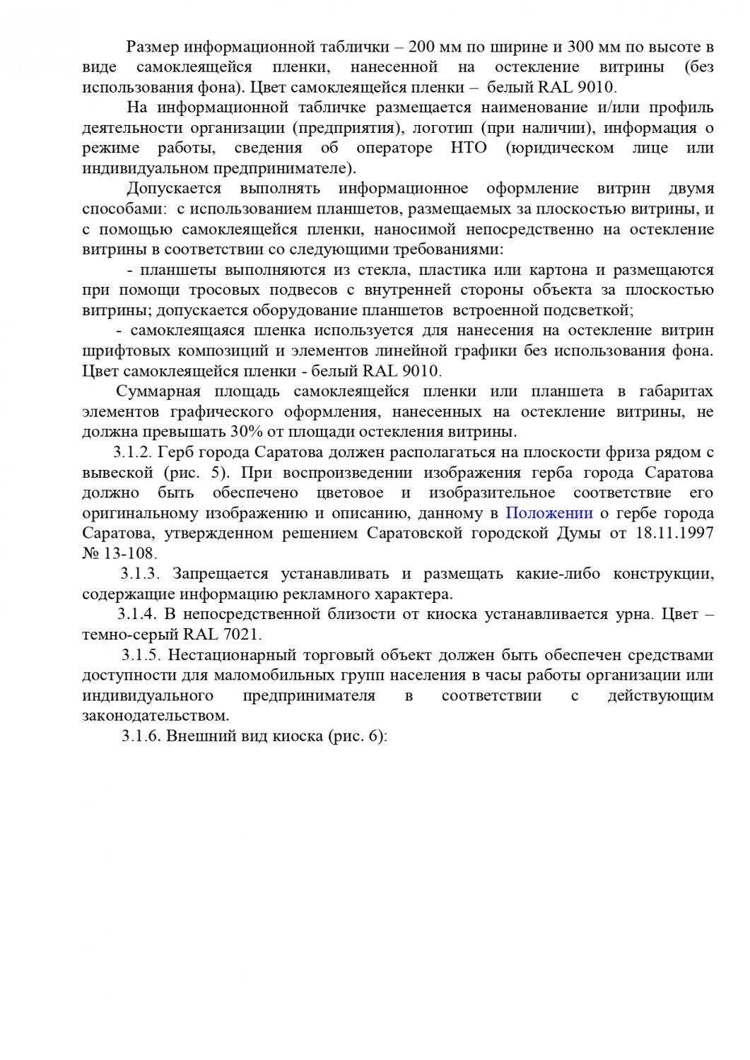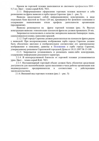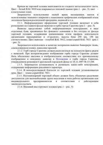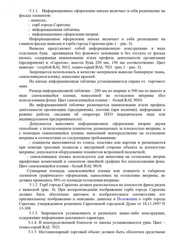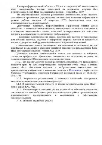 Общим для всех торговых объектов является запрет на устройство заглубленных фундаментов и подземных сооружений, а также размещение оборудования за пределами нестационарного торгового объекта. Также на вывесках запрещена краска, баннерная ткань и самоклеящаяся пленка. Обязателен герб Саратова.