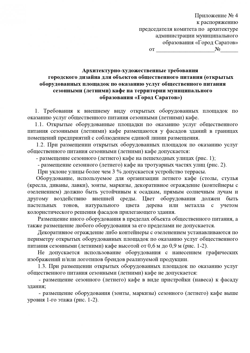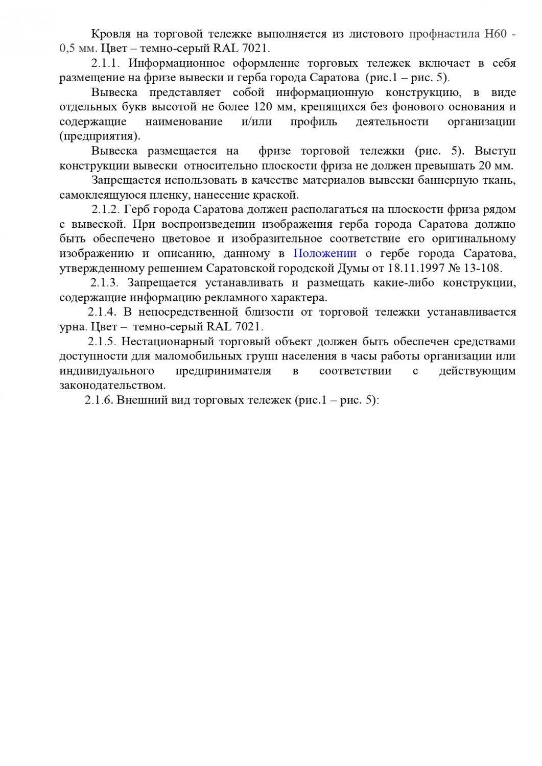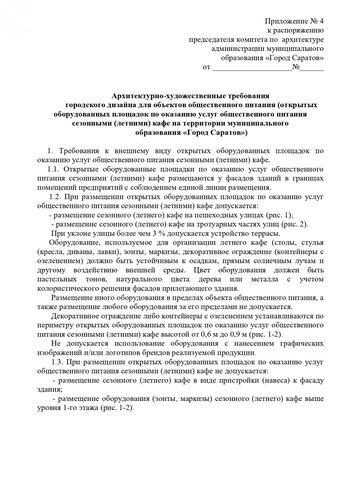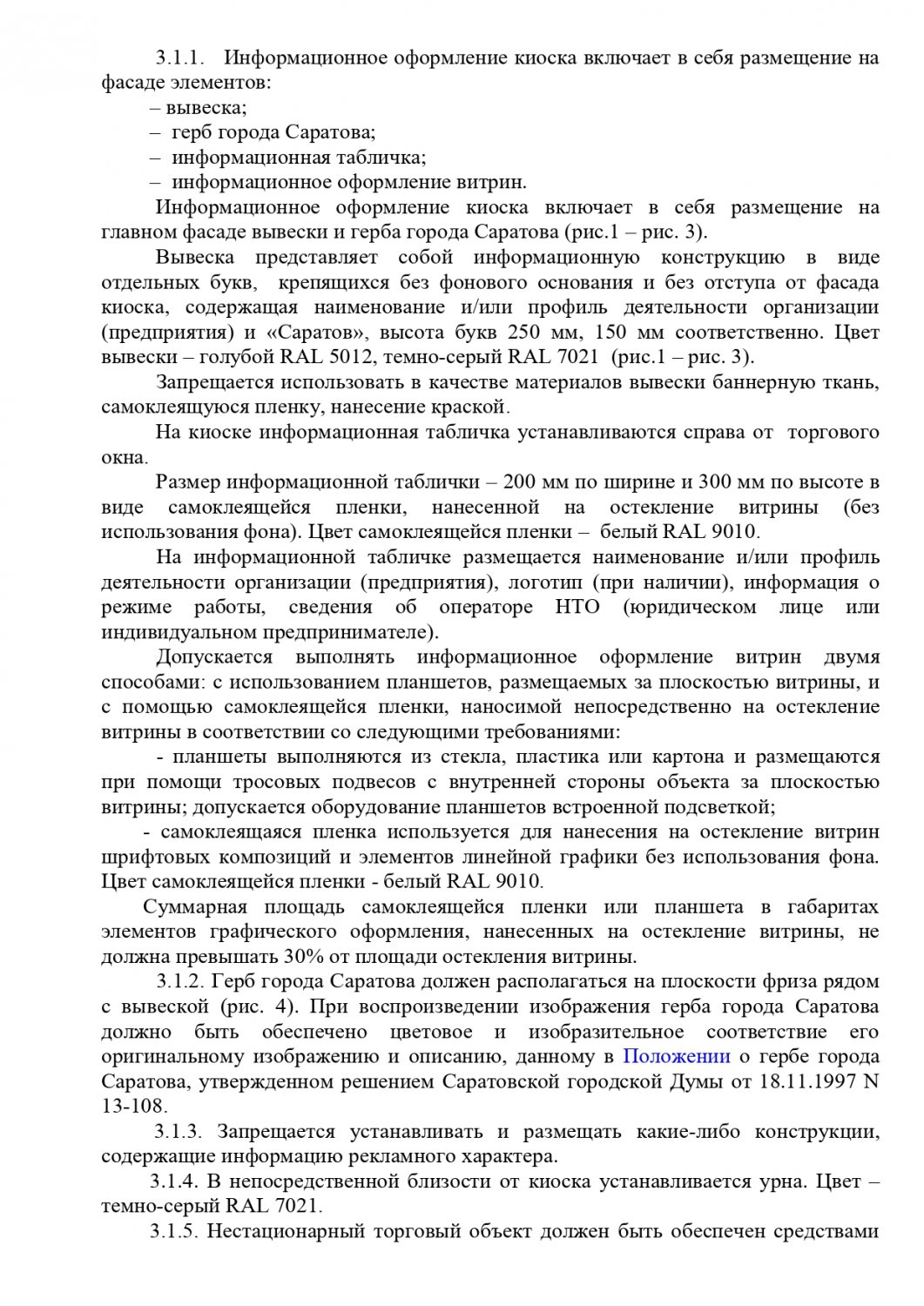 Общим для всех торговых объектов является запрет на устройство заглубленных фундаментов и подземных сооружений, а также размещение оборудования за пределами нестационарного торгового объекта. Также на вывесках запрещена краска, баннерная ткань и самоклеящаяся пленка. Обязателен герб Саратова.