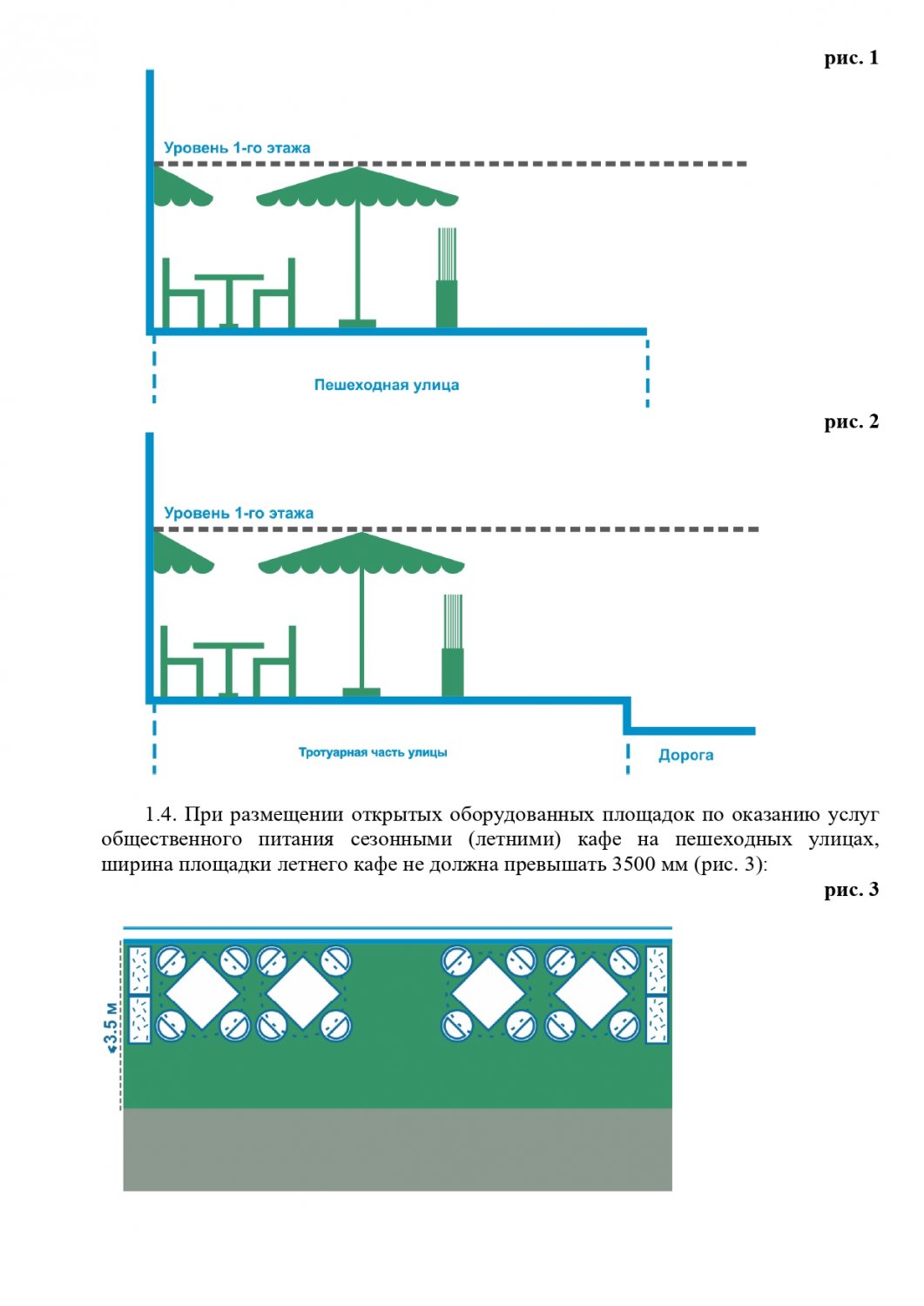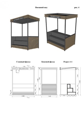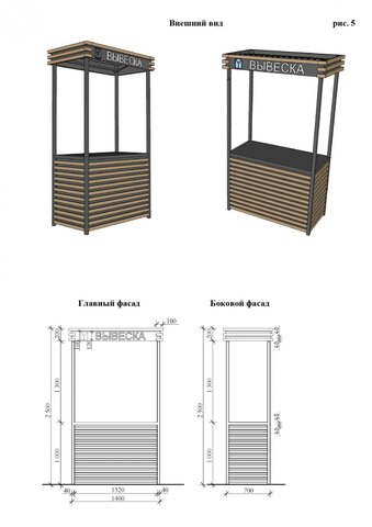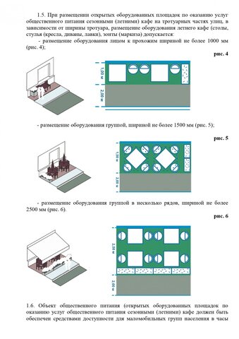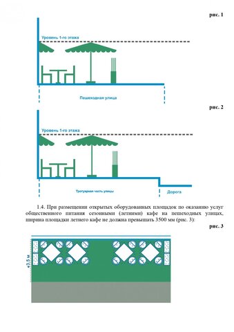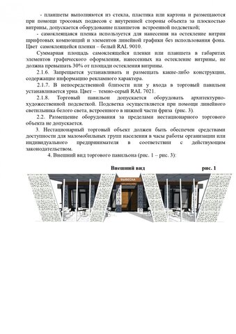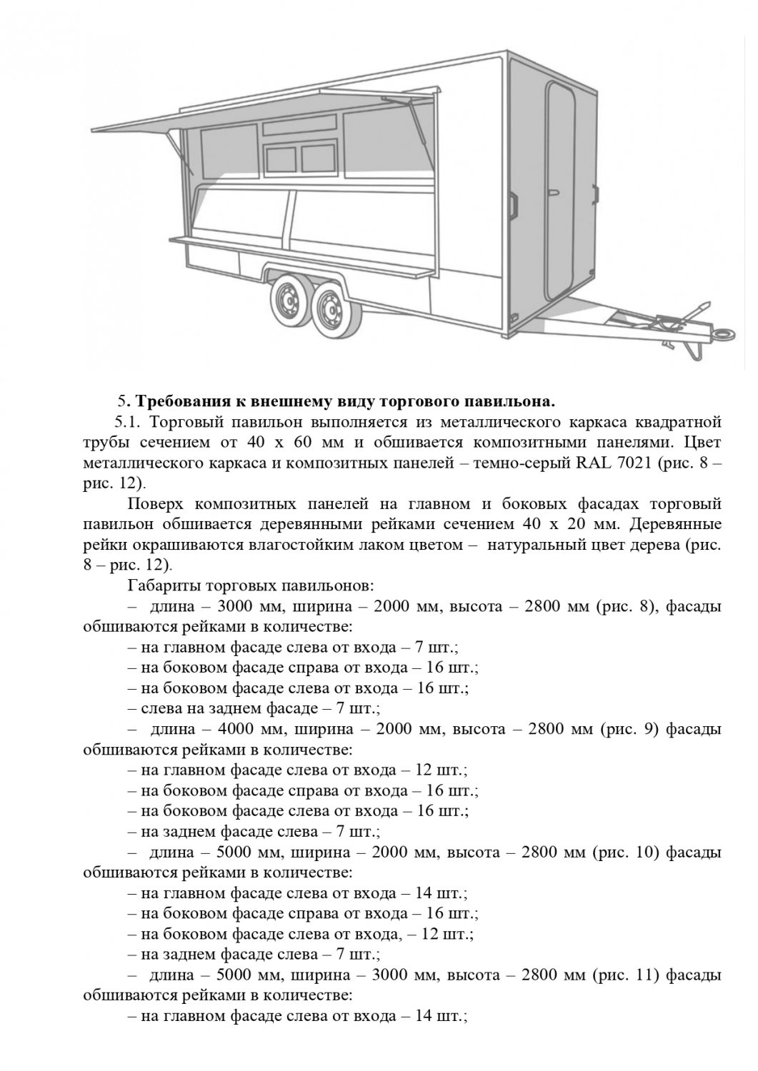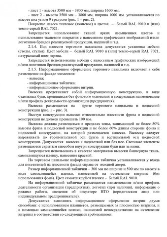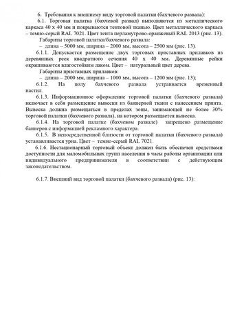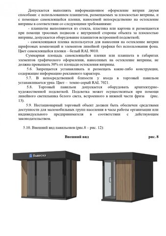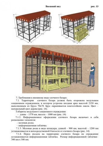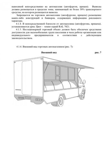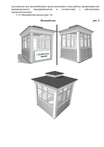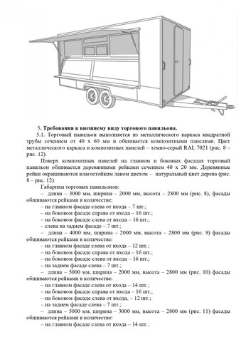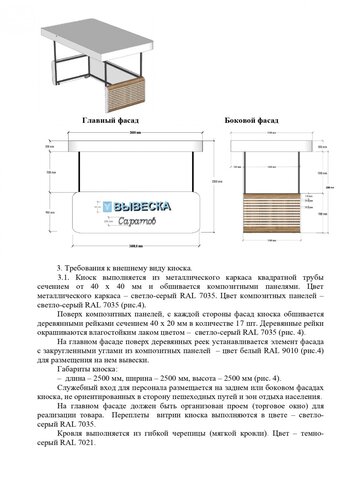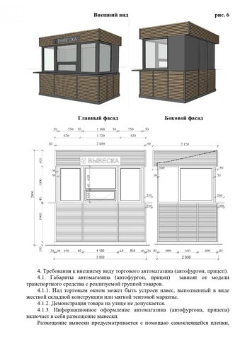 Стандартные киоски должны быть 3 на 2 метра. Суммарная площадь самоклеящейся пленки, нанесенной на остекление витрины, не должна превышать 30%. Допускаются даже павильоны размером 10 на 3 метра. Они должны быть темными и обиты деревянными рейками. Отдельно прописаны требования для летних кафе, бахчевых развалов и елочных базаров.