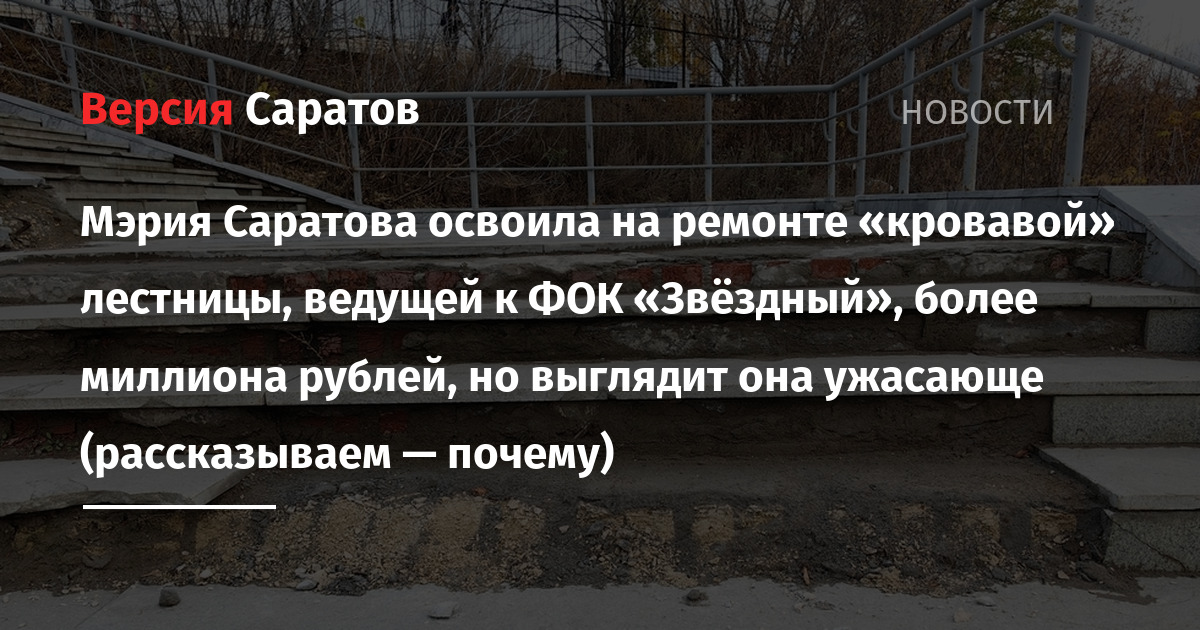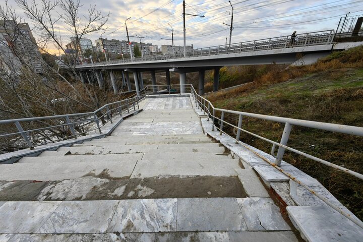 В редакцию ИА «Версия-Саратов» обратился читатель, шокированный состоянием лестницы в Волжском районе Саратова, которая ведет от моста через Глебучев овраг к ФОКу «Звездный». Саратовца очень удивило то, что лестница разбита и попросту опасна для горожан, ведь еще в июле 2025 года наша редакция писала о том, что проблемный объект собираются отремонтировать.