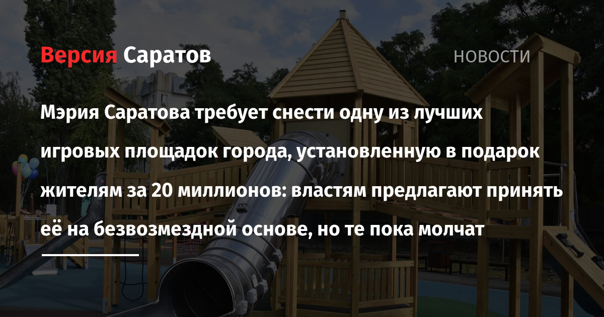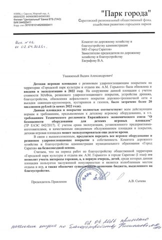 Узнав о планах властей уничтожить одну из лучших игровых зон Саратова, представители фонда «Парк города» направили в комитет дорожного хозяйства и благоустройства (председатель — Андрей Бондарев) и мэру Игорю Молчанову обращения с предложением принять игровое оборудование и резиновое ударопоглощающее покрытие в собственность на безвозмездной основе.