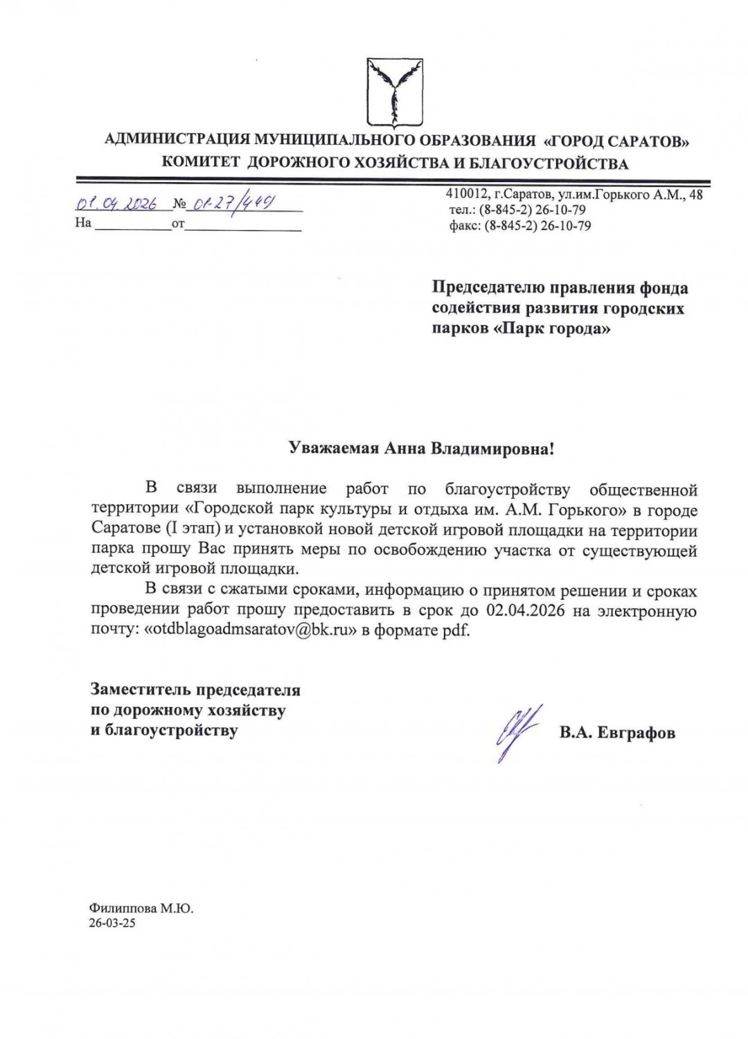 Считаем, что на период работ по благоустройству общественной территории «Городской парк культуры и отдыха им. А. М. Горького» в городе Саратове (I этап) это позволит учесть интересы горожан, а, в первую очередь, детей, а также обеспечит существенную экономию бюджета, выделенного на благоустройство».