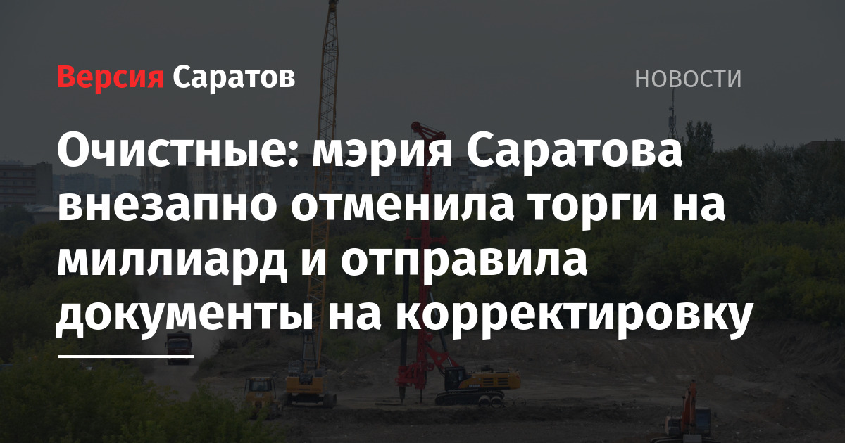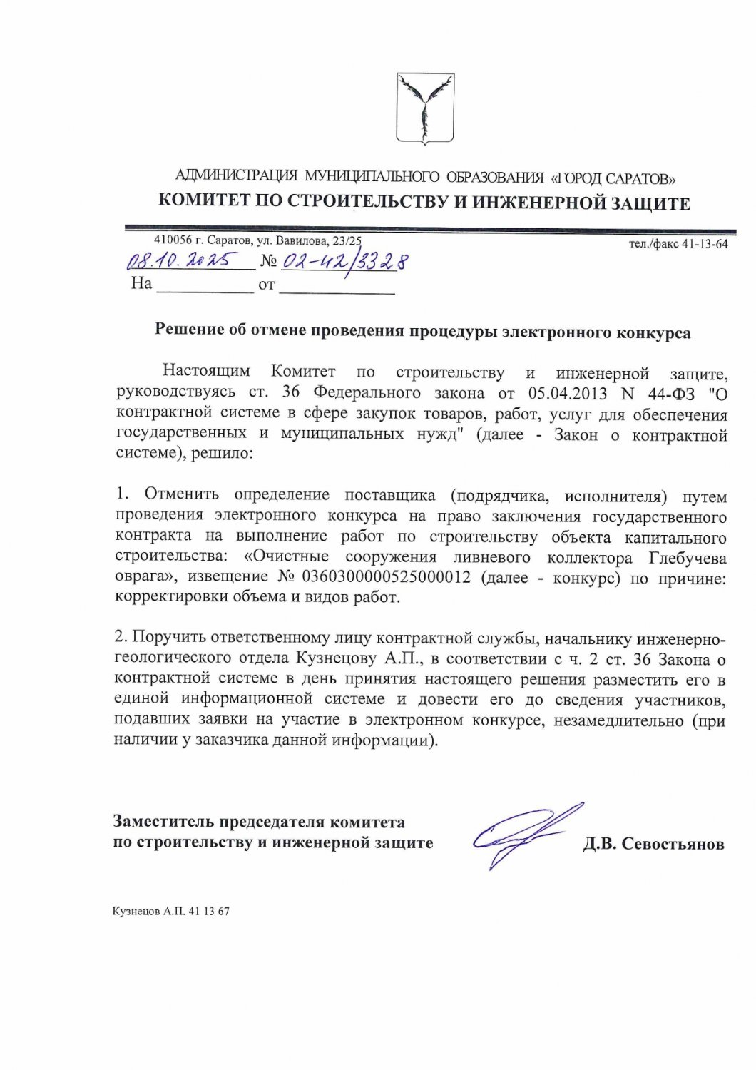 «Отменить определение поставщика (подрядчика, исполнителя) путем проведения электронного конкурса на право заключения государственного контракта на выполнение работ по строительству объекта капитального строительства: „Очистные сооружения ливневого коллектора Глебучева оврага“, извещение № 0360300000525000012 (далее конкурс) по причине: корректировки объема и видов работ», — отмечается в решении комитета по строительству и инженерной защите администрации Саратова.