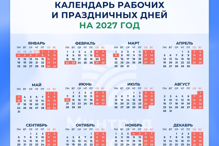Министерство труда РФ подготовило документ, которым утверждается производственный календарь на 2027 год. Из него следует, что в следующем году будет 30 праздничных дней.