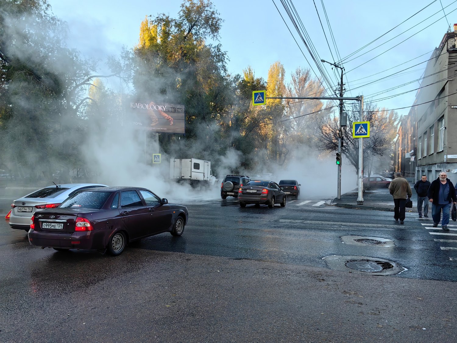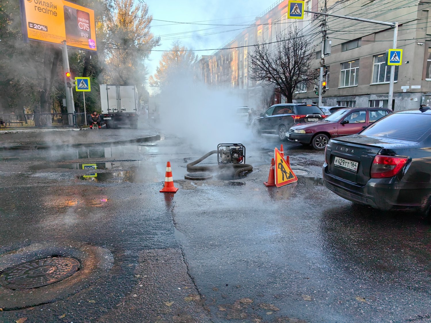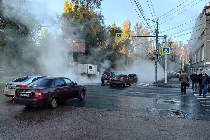 Сегодня утром, 23 октября, в центре Саратова произошла коммунальная авария, из-за которой оживленный перекресток Астраханской и Рабочей, в районе Детского парка, заволокло густым туманом. Видимость была практически нулевая. Корреспондент ИА «Версия-Саратов» оказался на месте аварии. В пресс-службе регионального филиала ПАО «Т Плюс» сообщили следующее: