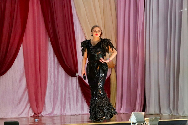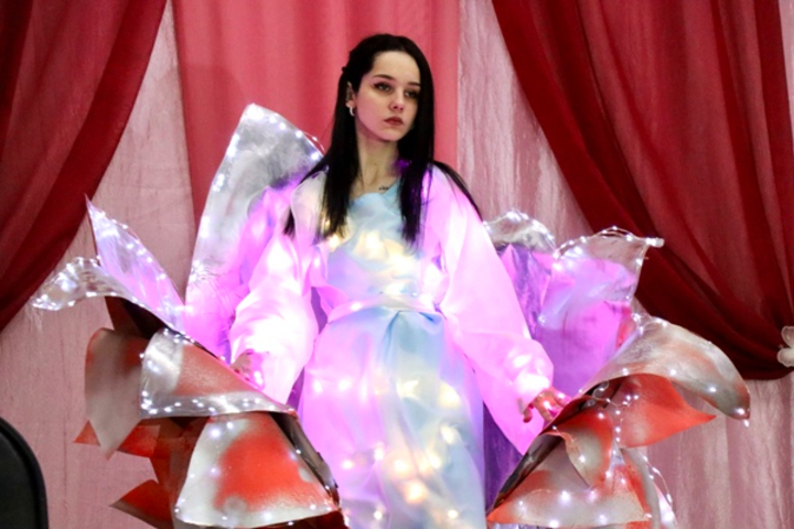 В номинации «Страна» девушка рассказала о прогулке по улицам родного города. Выступив в роли дизайнера, модельера и модели, на «Модном показе» Анастасия представила зрителям образ своей детской мечты — каркасное платье со светодиодами, украшенное цветами и бабочками.