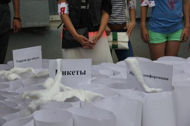 На бумажные соты молодогвардейцы положили три таблички с надписями: "пресс-конференции", "пикеты", "украли арт-объект". Посыпая поделку ватой, активисты скандировали: "Партия КПРФ - это митинг и пикет, от которых пользы нет".