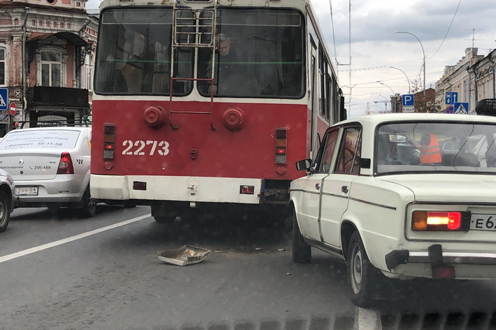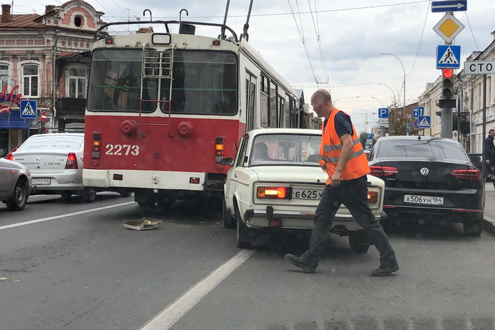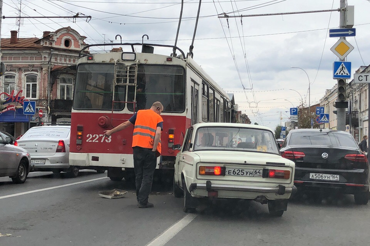 Сегодня в центре Саратова на улице Московской возле пересечения с Вольской произошло ДТП. Участники аварии — троллейбус и ВАЗ-2106.
