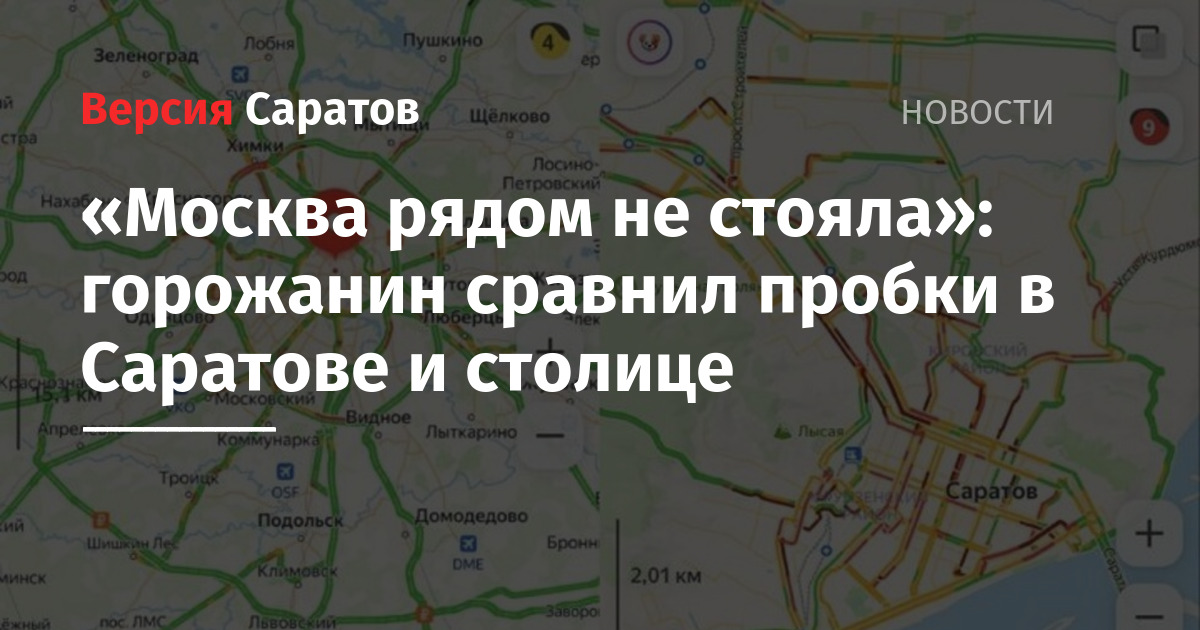 Сегодня сравнение решил провести один из саратовцев. Местный житель опубликовал в Telegram-чате Исаева два скришота с «Яндекс. Карт», на которых запечатлены дорожная обстановка в двух городах. На них видно, что пробки в Саратове составляют девять баллов, в Москве — четыре.