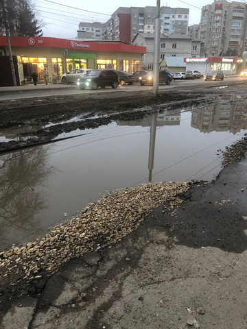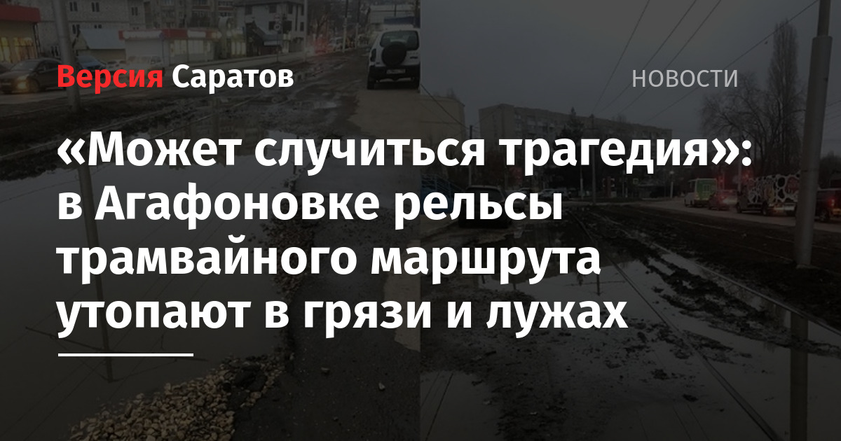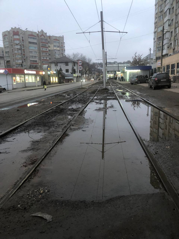 К сообщению женщина прикрепила несколько фотографий. На них видно, что рельсы утопают в лужах и грязи. Асфальт рядом с рельсами разбит.