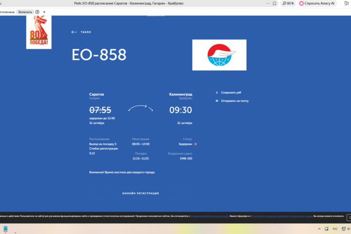 Самолёт из Саратова должен был вылететь в 7:55 и прибыть в Калининград в 9:30. Теперь время вылета сдвинули на 12:40. Что стало причиной задержки — неизвестно. Отметим, что сегодня ночью «Гагарин» не закрывали. Однако была закрыта воздушная гавань в Волгограде.