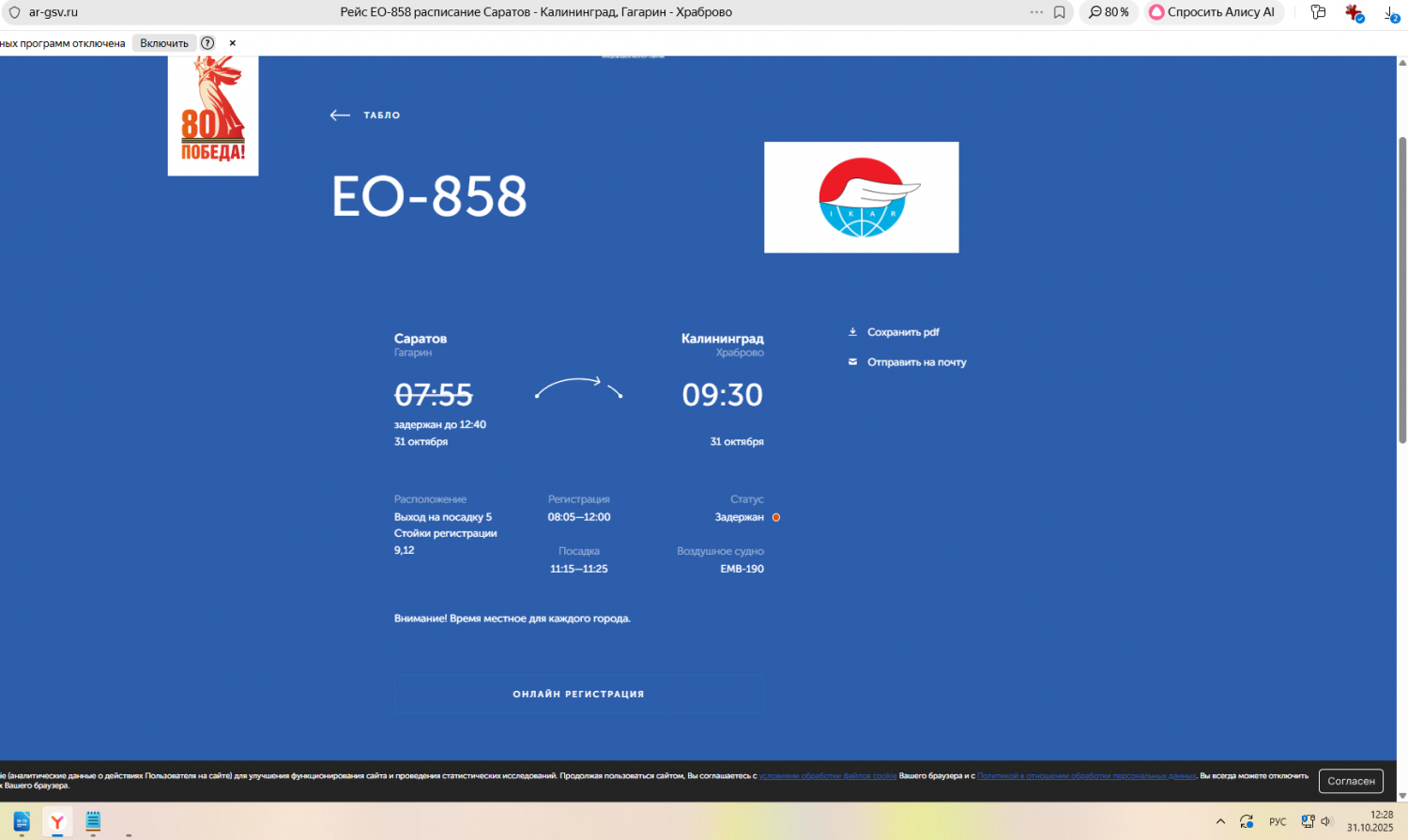 Самолёт из Саратова должен был вылететь в 7:55 и прибыть в Калининград в 9:30. Теперь время вылета сдвинули на 12:40. Что стало причиной задержки — неизвестно. Отметим, что сегодня ночью «Гагарин» не закрывали. Однако была закрыта воздушная гавань в Волгограде.