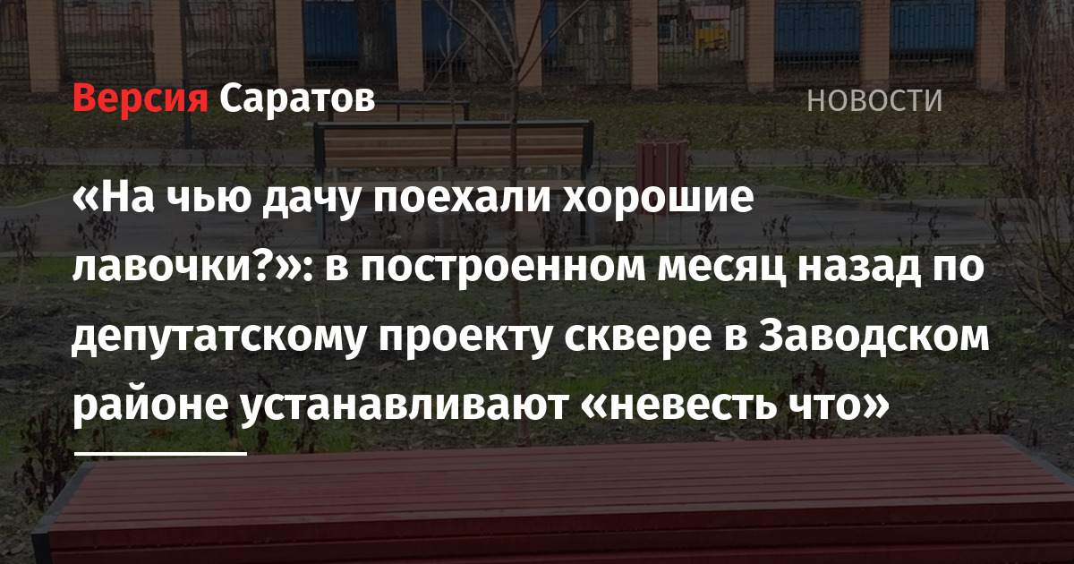 По словам саратовчанки, сквер появился месяц назад. Там установили «хорошие лавочки со спинкой». «Месяц эти лавочки постояли. Теперь их демонтируют. Уже второй день ставят новые — невесть что, лавочками это назвать трудно. На чью дачу поехали хорошие лавочки, а вместо них установили убогие?» — поинтересовалась горожанка.