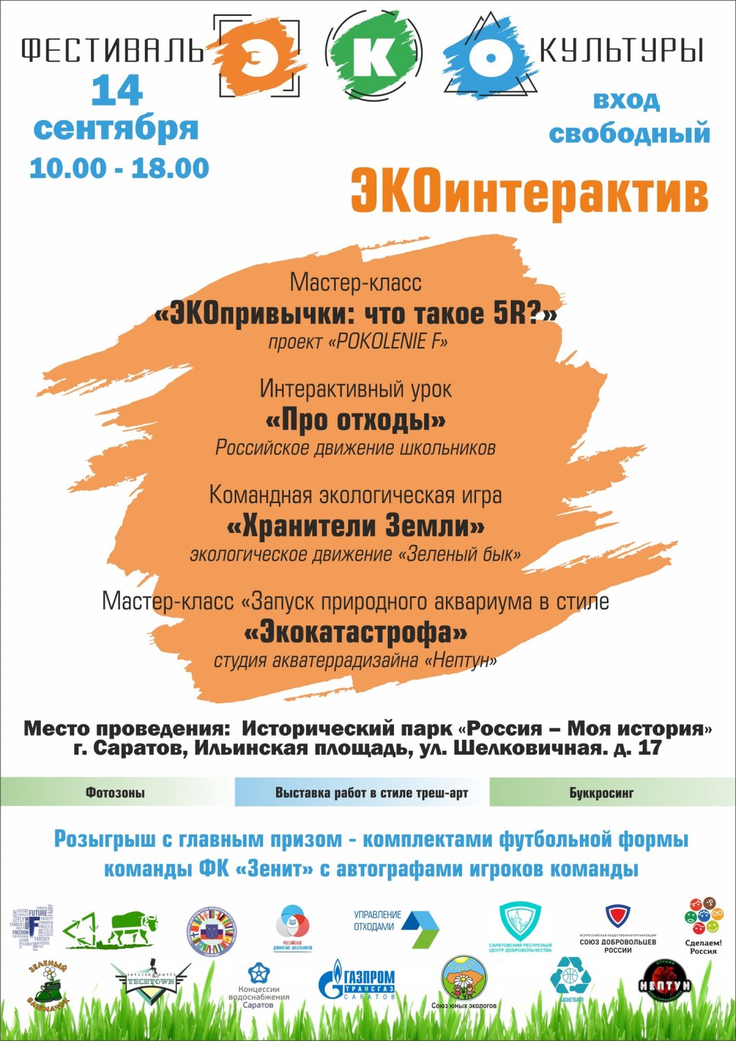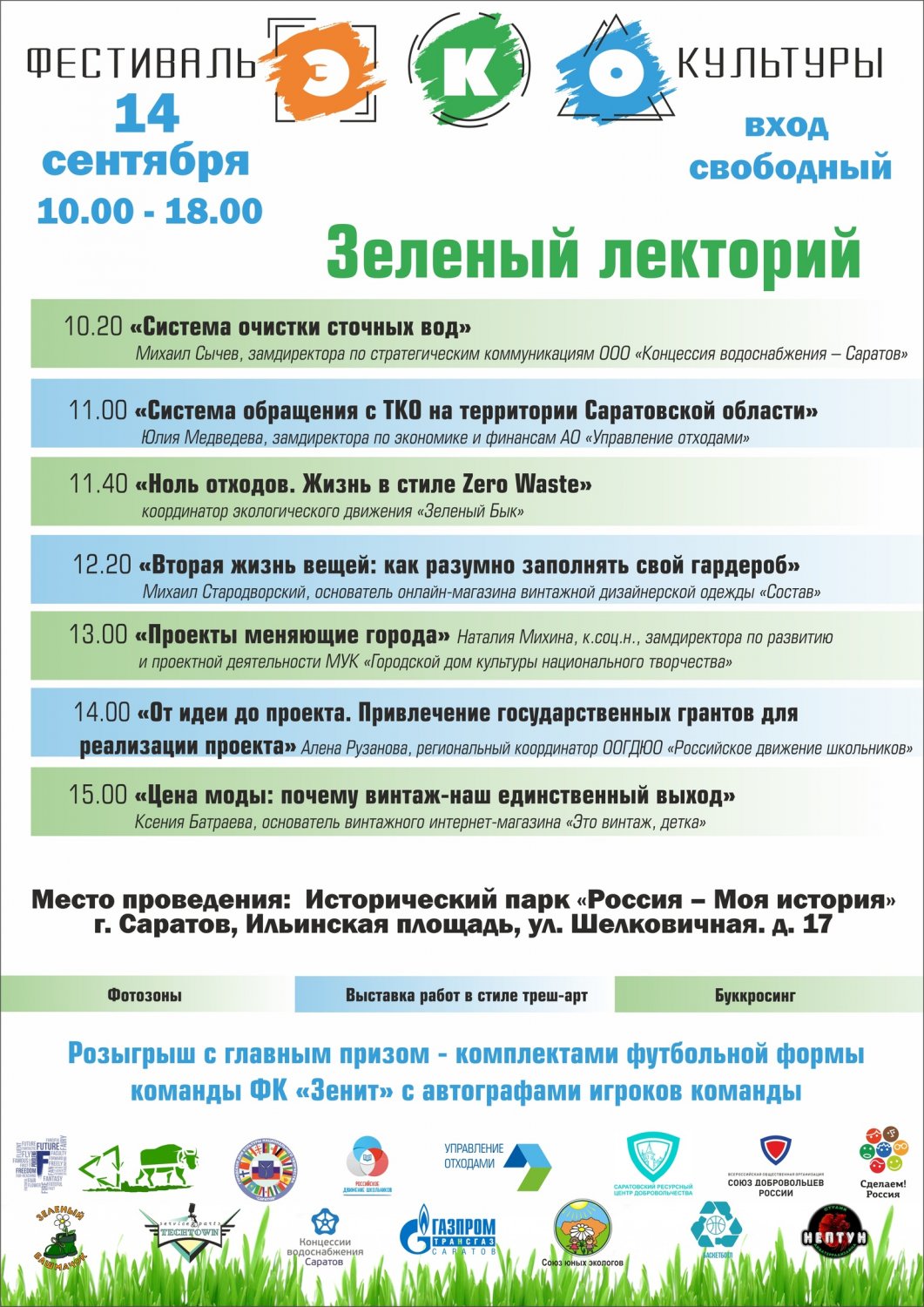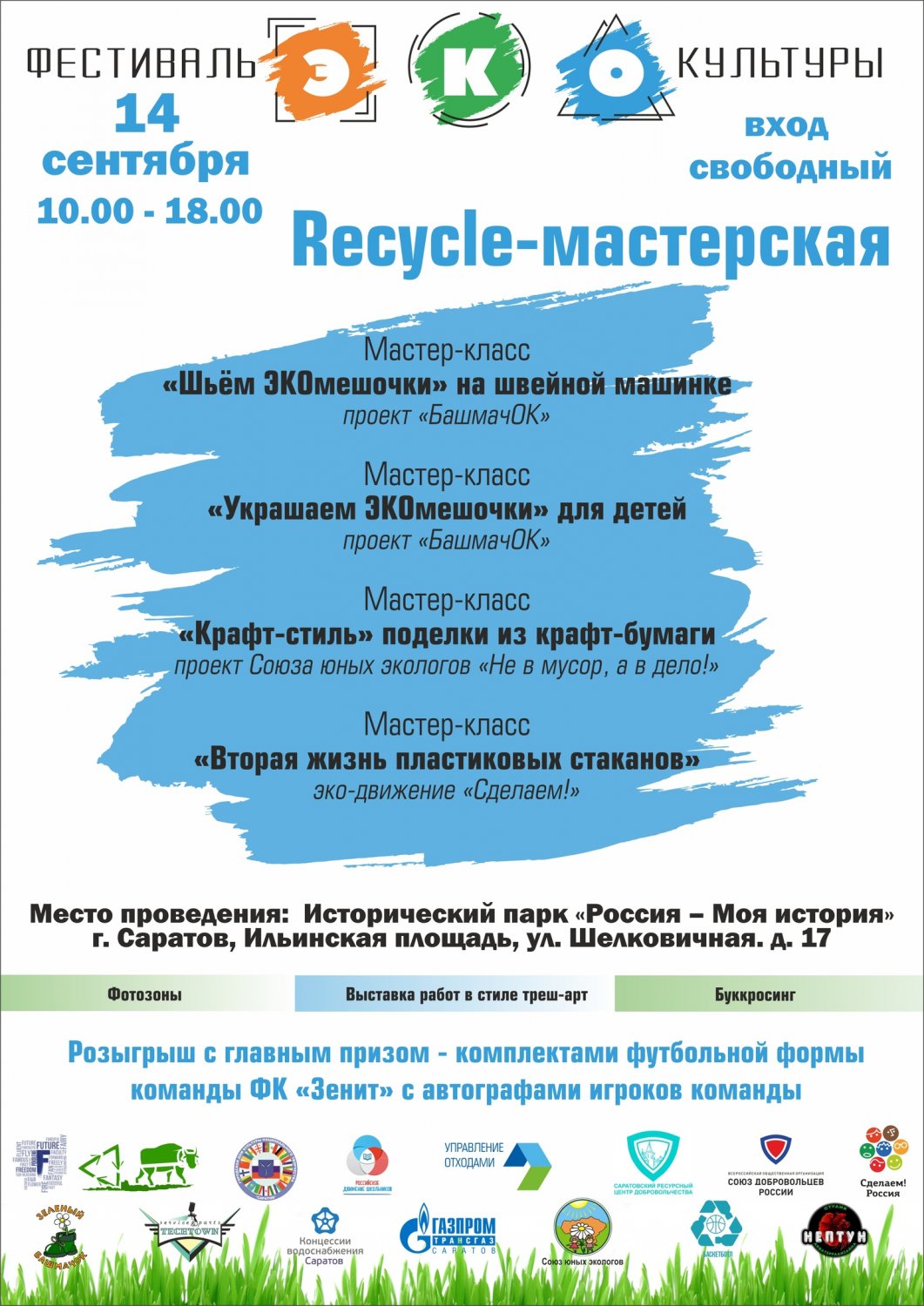 В течение всего дня будут открыты уникальные фотозоны и выставка работ в стиле треш-арт. Любители книг смогут обменяться ими на площадке буккросинга. Завершится фестиваль розыгрышем комплектов формы футбольного клуба «Зенит» с автографами игроков и других подарков. Мероприятие пройдет с 10.00 до 18.00.