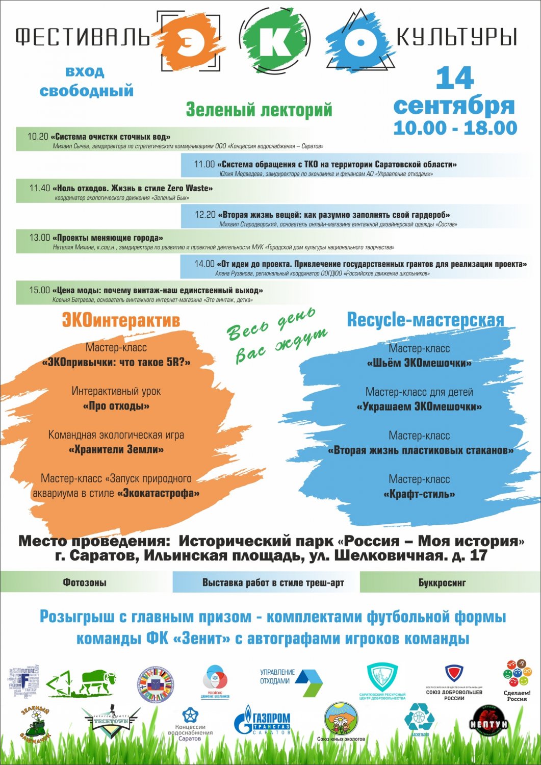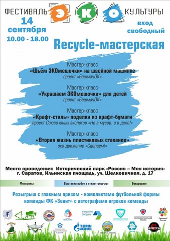 Спикеры «Зеленого лектория» расскажут о второй жизни вещей, жизни в стиле «Zero waste» и проектной деятельности. В ходе ЭКОинтерактивов детей и взрослых научат шить и украшать эко-мешочки, а также изготавливать поделки из переработанной бумаги. Любители игр смогут в течение дня сразиться в настольную стратегию «Хранители Земли». Для участников всех возрастов в увлекательной форме расскажут о типах отходов, которые мы образуем в процессе жизнедеятельности.