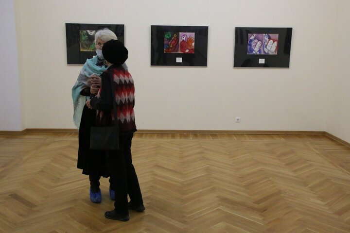 Затем она провела гостей по залам, пояснив к какому периоду относится тот или иной экспозиционный отдел. В одном из залов для посетителей выставки подготовили фотозону, основой для которой стала работа Марка Шагала «Райский сад».
