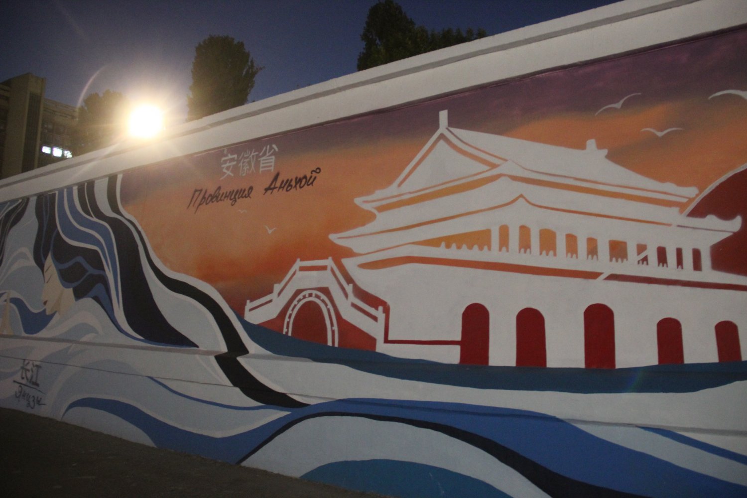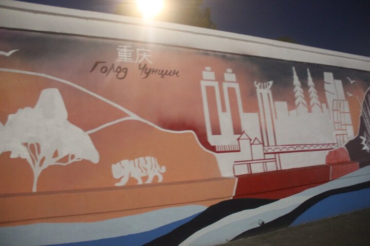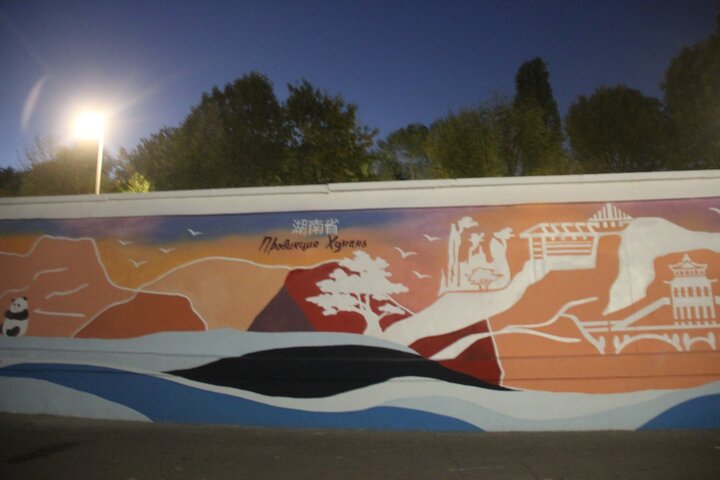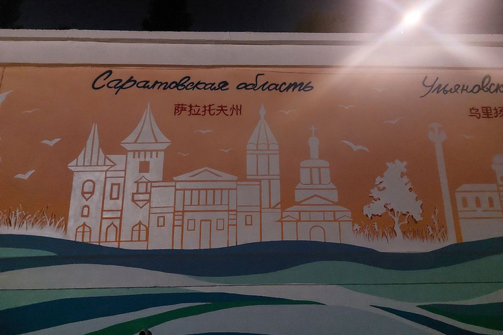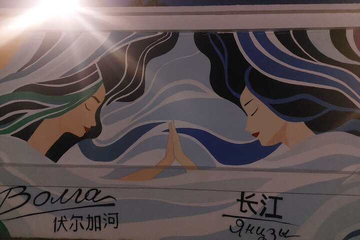 «Удалось попасть на набережную только к вечеру, но мурал даже в темное время суток выглядит очень красиво. На одной его половине изображены достопримечательности регионов Поволжья, а на другой — китайские. В центре нарисованы две девушки, олицетворяющие две великие реки. Очень эффектно!
