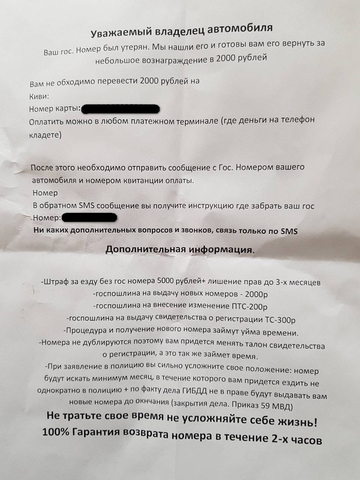 В записке мошенники заявляют, что владелец «потерял» госномер, и они готовы его вернуть за 2000 рублей. Далее указан номер киви-кошелька для перевода денег. Преступники подробно расписывают, что грозит гражданину за езду без номеров и призывают просто заплатить им, не осложняя себе жизнь. После оплаты они обещают вернуть номер в течение двух часов.