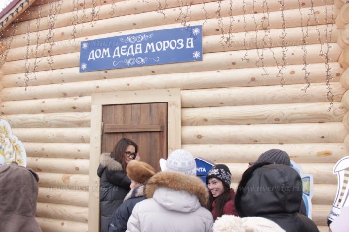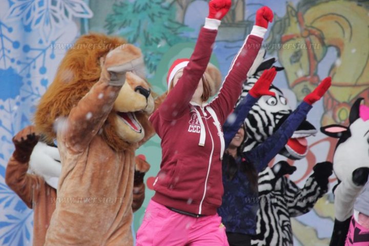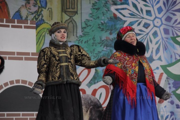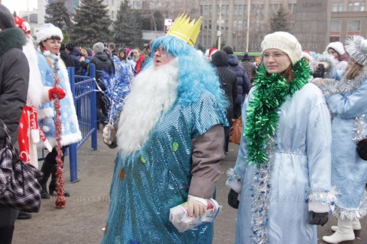 В Саратове на Театральной площади прошло торжественное открытие главной городской елки. До начала церемонии по проспекту Кирова прошла колонна людей, переодетых в сказочных персонажей. Во главе процессии в повозке ехали Дед Мороз и Снегурочка.