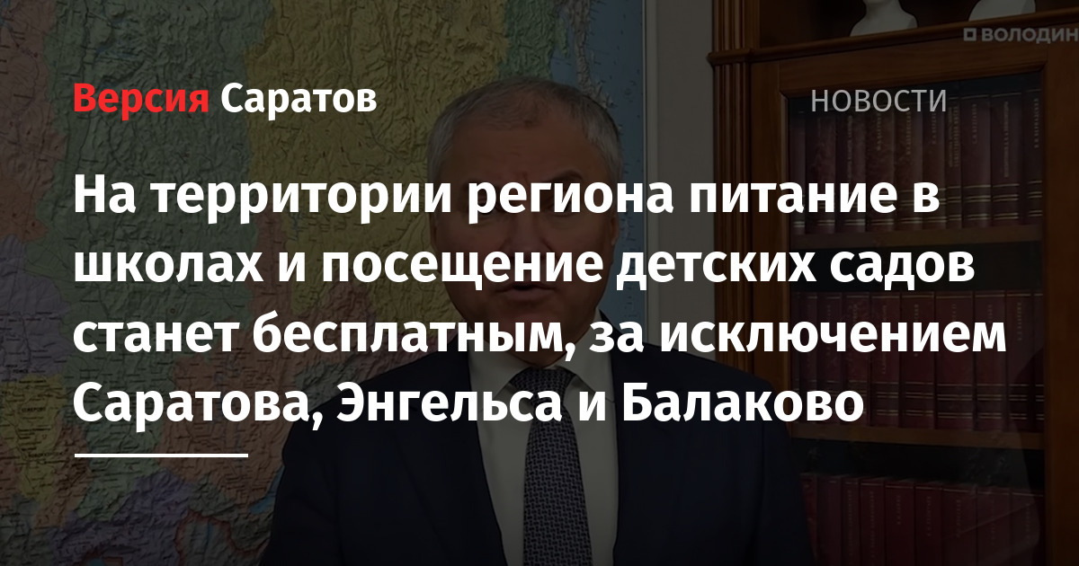 «Речь идет о введении со следующего года бесплатного питания в школах, включая 11 класс, бесплатное посещение детского садика и бесплатное питание в группах продленного дня именно в сельской местности, в селах, поселках и малых городах с численностью населения до 100 тысяч человек. Этот проект будет реализован на территории Саратовской области, он также будет включать в себя Гагаринский район города Саратова, также села и поселки Энгельсского и Балаковского районов», — заявил Володин.