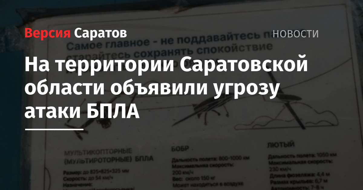 «Внимание! Угроза атаки БПЛА на территории Саратовской области», — говорится в предупреждении.