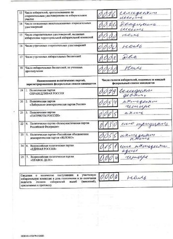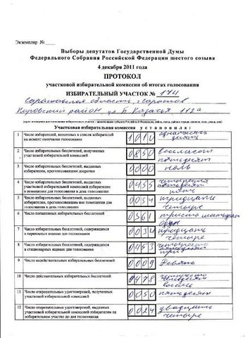 Коммунистка Ольга Алимова передала ИА "Версия-Саратов" протокол выборов с избирательного участка №174. Этот участок интересен тем, что за весь день на нем не было зафиксировано ни одного нарушения, и, по мнению Ольги Николаевны, данный протокол демонстрирует реальные симпатии жителей Саратова. Согласно протоколу, "Единая Россия" набрала на данном участке 30,88%, КПРФ - 26,5%, "Справедливая Россия" - 16,15 %, "Яблоко" - 11,25%, ЛДПР - 11,04%, "Патриоты России" и "Правое дело" - меньше процента.