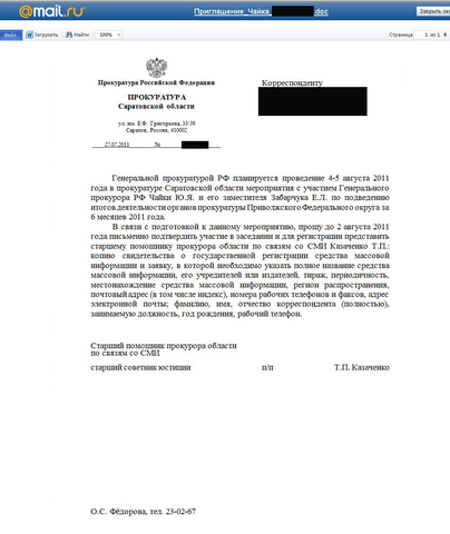 Однако, как выяснилось, на самом деле все не совсем так, как представила Казаченко. В распоряжении ИА "Версия-Саратов" оказалась рассылка из областной прокуратуры от имени старшего помощника прокурора области по связям со СМИ Татьяны Казаченко. Письмо от 28 июля адресовалось корреспонденту одного из средств массовой информации. В документе Татьяна Павловна просит в связи с визитом руководства Генпрокуратуры РФ предоставить в адрес областного ведомства необходимые документы для участия в совещании.