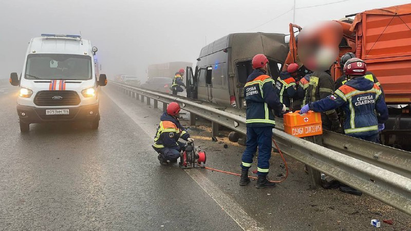 По информации ведомства, в 9:10 в Гагаринском районе недалеко от села Еремеевка столкнулись шесть машин: три КамАЗа, «ГАЗель» Ford Transit (не рейсовая), Toyota и Volvo.