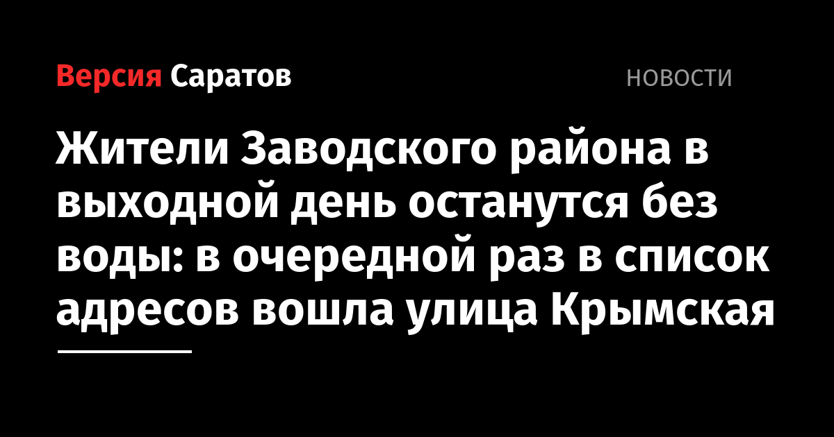 Ограничение вводится в связи с проведением сварочных работ на городском водопроводе по адресу: Ново-Астраханское шоссе, 87. Из-за них с 10:00 до 20:00 будет ограничено холодное водоснабжение абонентов улиц: Марины Расковой; Ново-Астраханское шоссе от Крымской до улицы Марины Расковой; Крымская (четная сторона). Отметим, что жители домов на Крымской постоянно остаются без холодной воды. А, например, течь у гимназии № 58 начали устранять только после публикации ИА «Версия-Саратов» и вмешательства прокуратуры.