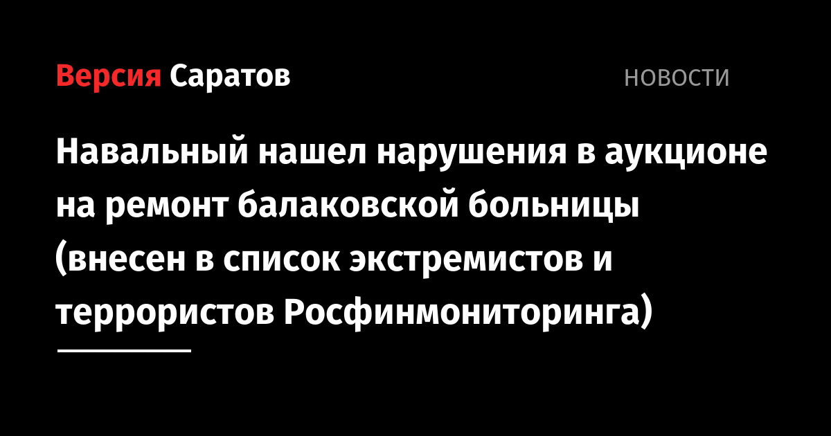 Известный блогер, руководитель проекта «РосПил» Алексей Навальный (внесен в список экстремистов и террористов Росфинмониторинга) написал жалобу на заказчика проведения открытого аукциона на определение подрядчика для выполнения капитального ремонта неврологических отделений № 1 и № 2 МБУЗ «Городская больница № 1» города Балаково. Комиссия Саратовского УФАС России в итоге обнаружила нарушения при проведении аукциона. Об этом сообщает портал CompromatBalakovo.