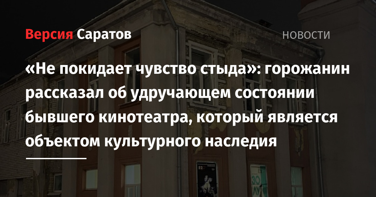 Житель Саратова обратил внимание на удручающее состояние здания бывшего кинотеатра «Темп», в котором размещается театр «Версия». Сообщение опубликовали в Telegram-канале «Говорит Саратов».