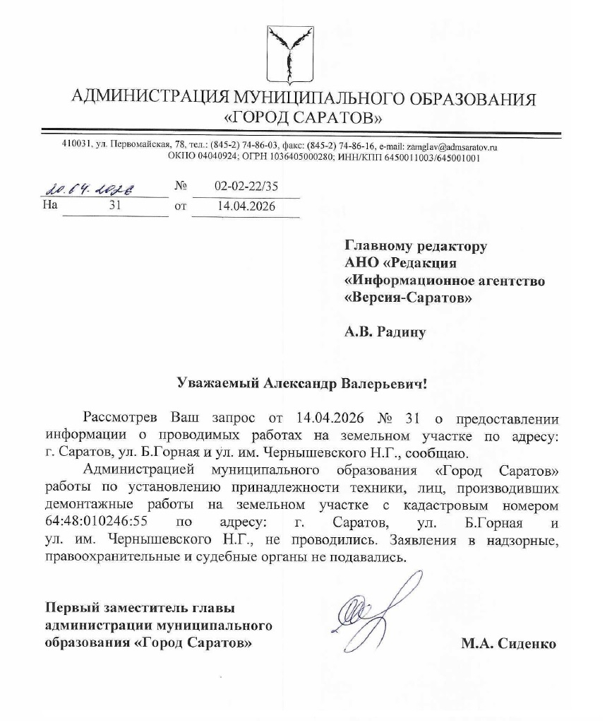 «Администрацией муниципального образования „Город Саратов“ работы по установлению принадлежности техники, лиц, производивших демонтажные работы на земельном участке с кадастровым номером 64:48:010246:55 не проводились. Заявления в надзорные, правоохранительные и судебные органы не подавались», — говорится в ответе за подписью Максима Сиденко от 20 апреля 2026 года.