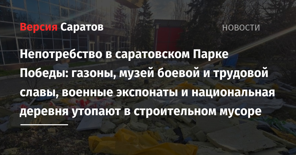 Строительными отходами оказались завалены газоны напротив музея боевой и трудовой славы (директор — Борис Шинчук), а также территория, где располагаются экспонаты с военной техникой, и зона, занятая национальной деревней с различными подворьями. Как мэрия Саратова (глава — Игорь Молчанов) допустила такое позорное состояние Парка Победы — пока открытый вопрос.