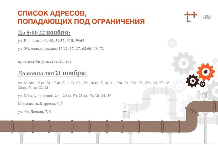 По информации ПАО «Т Плюс», энергетики проводят ремонтные работы на нескольких участках теплосетей. На Мира работы планируют завершить до конца дня; на Железнодорожной и проспекте Энтузиастов — до 08:00 22 ноября. С адресами, попавшими под отключение, можно ознакомиться в карточке ниже.
