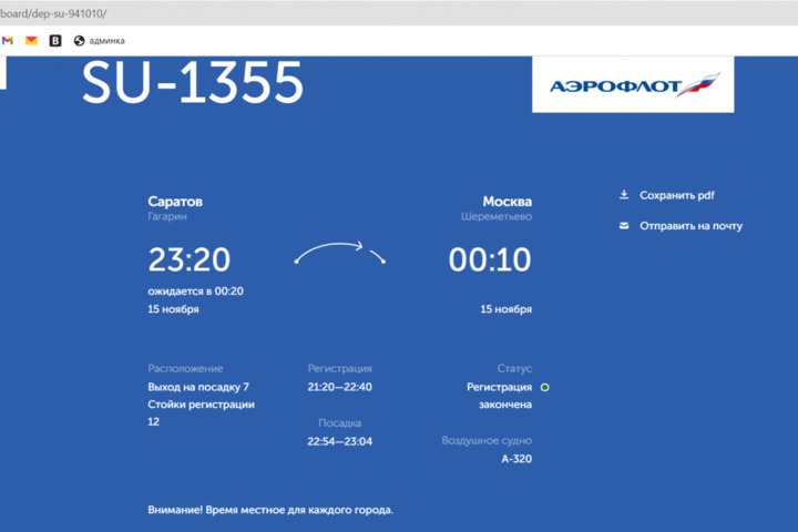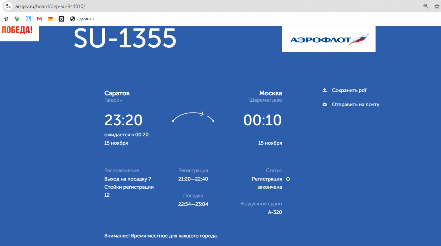 По данным онлайн-табло «Гагарина», сейчас задержан вылета судна из Саратова в Москву. С 23:20 его пока что перенесли на 0:20.