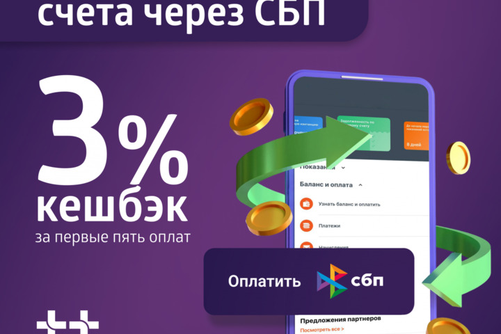 С 1 декабря 2025 года по 31 марта 2026 года по московскому времени клиенты «ЭнергосбыТ Плюс» могут получить кешбэк* 3% при оплате счетов через Систему быстрых платежей (СБП). Акция проводится «ЭнергосбыТ Плюс» совместно с Национальной системой платёжных карт.