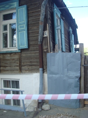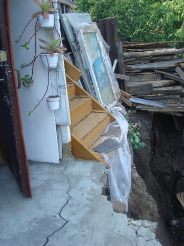Эти "специалисты" даже акт составили, в котором говорится о том, что "в течение некоторого времени возможно появление отдельных незначительных трещин в грунте, которые не представляют никакой угрозы конструкциям жилого дома". Однако, как видно на фото с места событий, одна из таких вот "незначительных" трещин превратилась в обрыв, в который упирается крыльцо дома. К счастью, пенсионерка, проживающая в одной из квартир дома, не пострадала. А ведь это крыльцо - единственный выход из ее комнаты наружу.