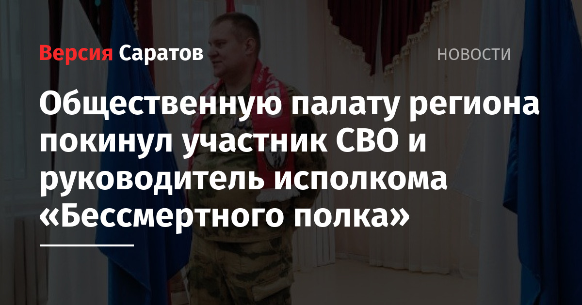 Из Общественной палаты вышел руководитель исполкома движения «Бессмертный полк России» по Саратовской области, участник специальной военной операции Андрей Бердников. Он также является помощником окружного атамана Волжского окружного войска и членом регионального отделения организации «Боевое братство». Его полномочия прекращены в связи с подачей личного заявления. Почему общественник принят такое решение, не уточняется.