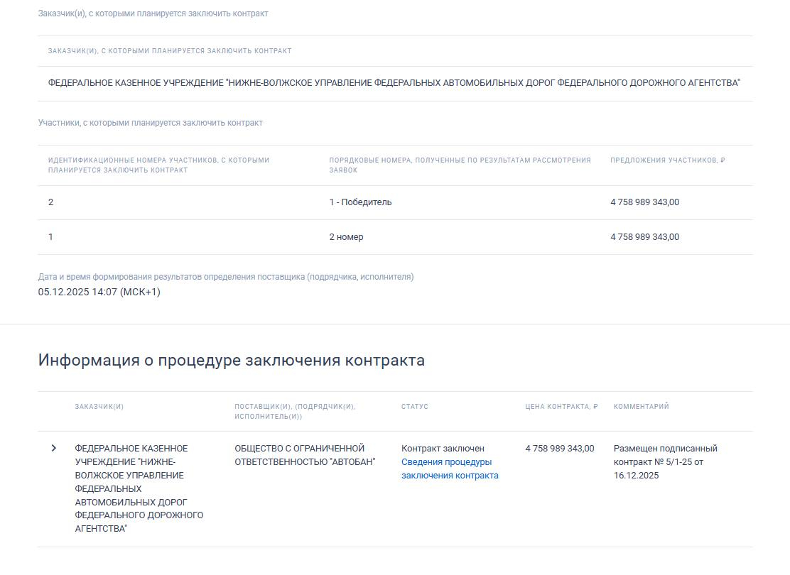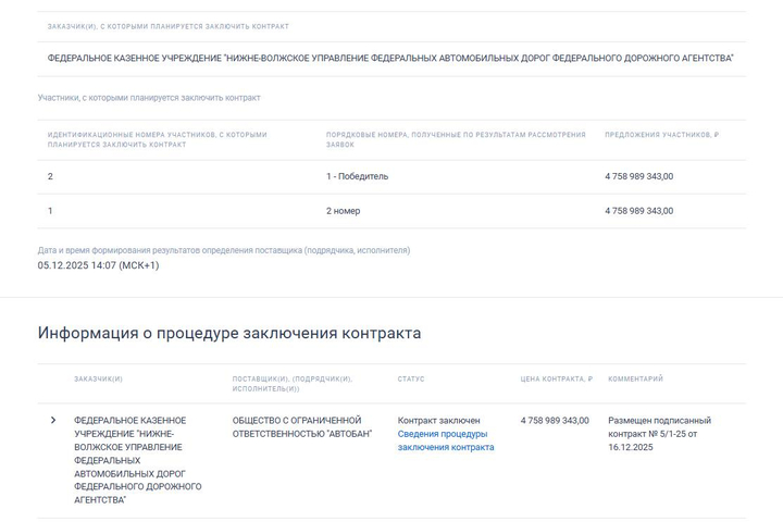 Победителем вышло ООО «Автобан», гендиректором и совладельцем которого является Тигран Киракосян — брат депутата Саратовской областной думы Гагика Киракосяна («Единая Россия»). «Автобан» согласился выполнить работы по максимальной цене 4 млрд 758 млн рублей. Работы нужно исполнить с 1 апреля 2026 года по 31 мая 2027 года.