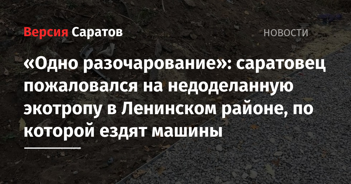 «Вчера прошелся по экотропе от Ласточкино до „Территории детства“. Честно, одно разочарование. Борта уже развалились, и вся щебенка вывалилась. Плюс щебенка дешевая и начала превращаться в глину на некоторых участках. Мусором от гаражников завалена вся лесополоса, и его никто не планирует убирать. Везде валяется бетон и плиты разрушенные. Разбиты новые фонари. Навалены деревья и ветки на тропинках. Беспрепятственно по экотропе ездят машины и давят людей, кто гуляет. Новый забор из не останавливает. И самое главное — не сделали ее до конца», — написал саратовец.