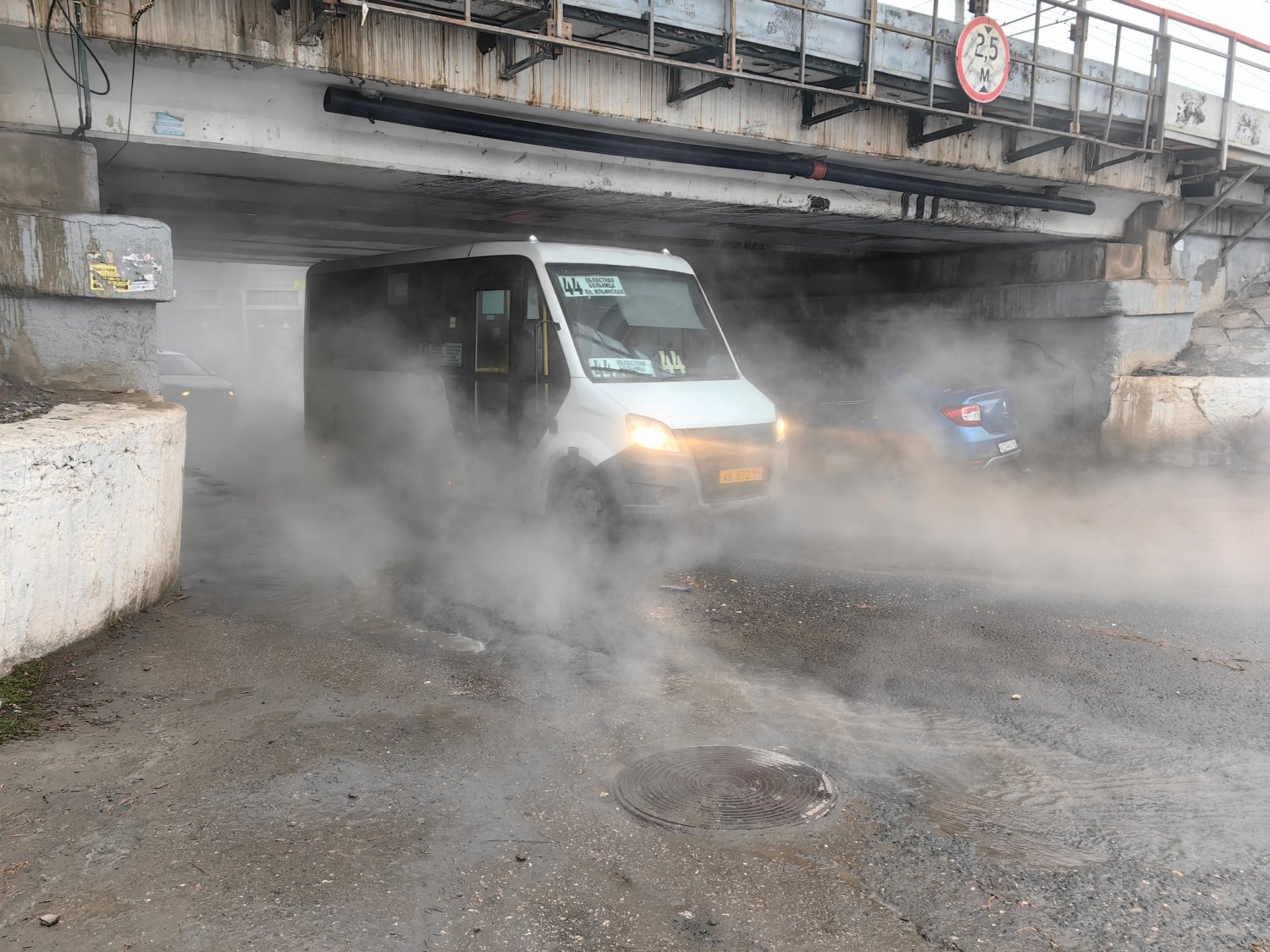 «Под „мостом глупости“ на Рабочей потоп. На единственной пешеходной дорожке настоящий ад: под ногами кипяток, вонь жуткая, дышать нечем. На Шелковичной, по пути под мост пробка огромная», — пояснил горожанин.