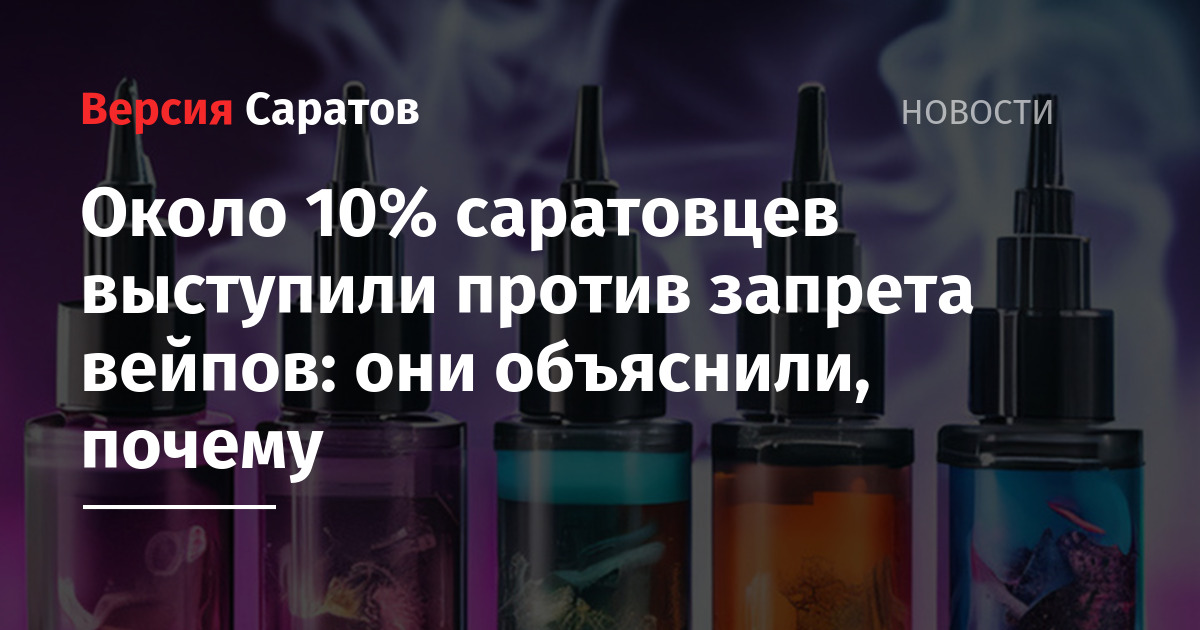 Около 10% опрошенных саратовцев высказались против запрета вейпов. Об этом сообщает сервис по поиску работы Superjob. Они называли следующие аргументы: «От вейпов ни мусора, ни дыма. Они почти не пахнут»; «Будут продавать бесконтрольно, подпольно».