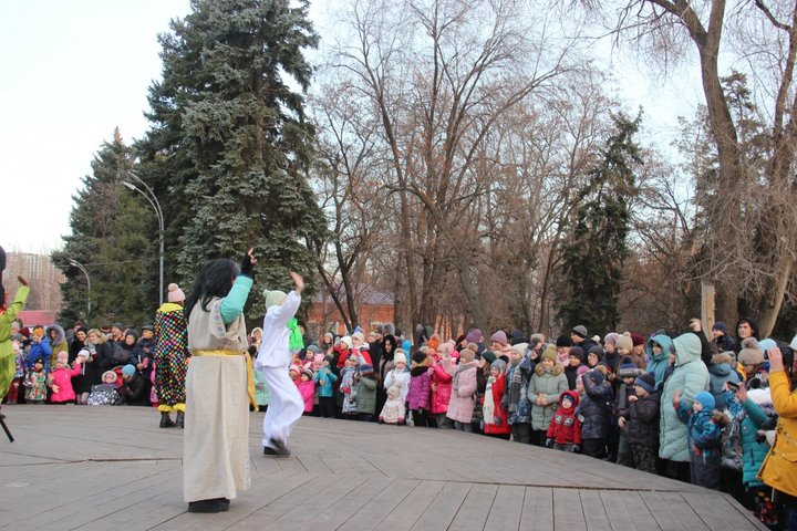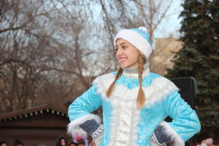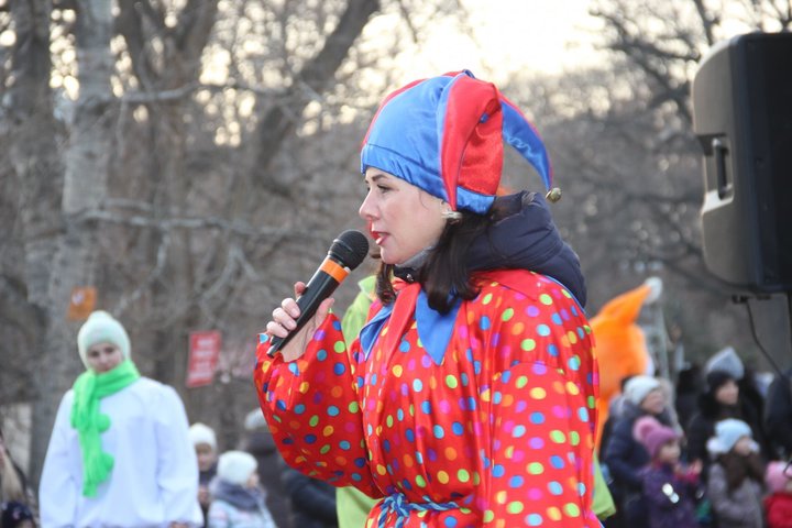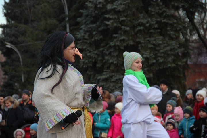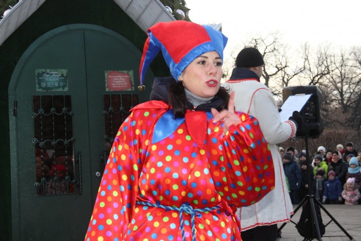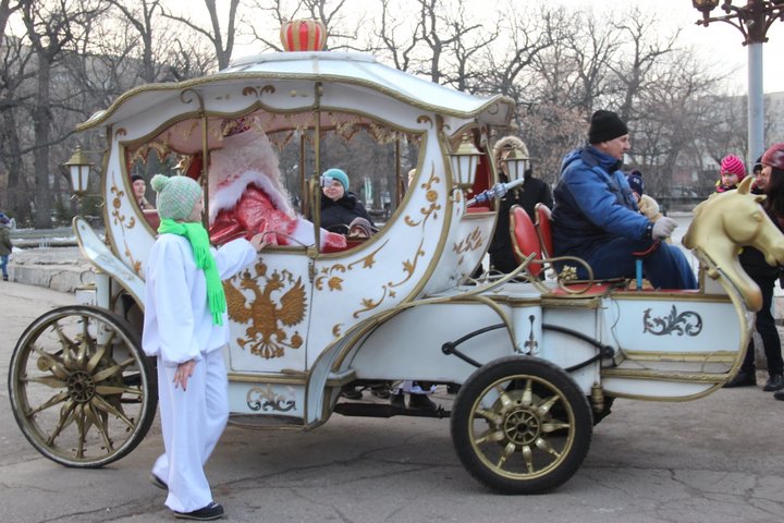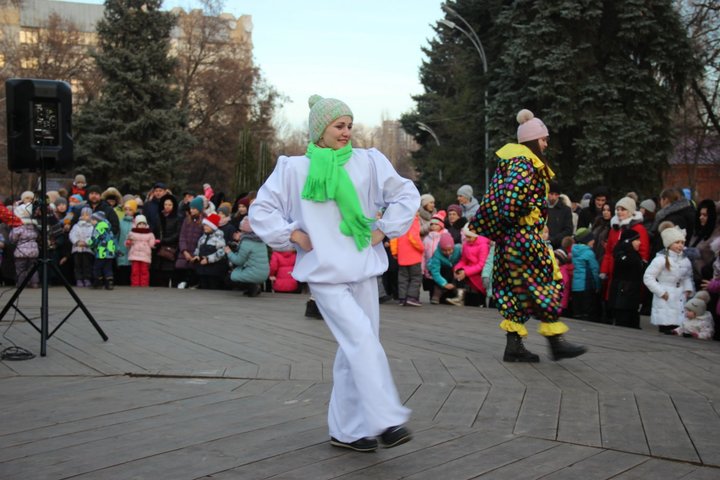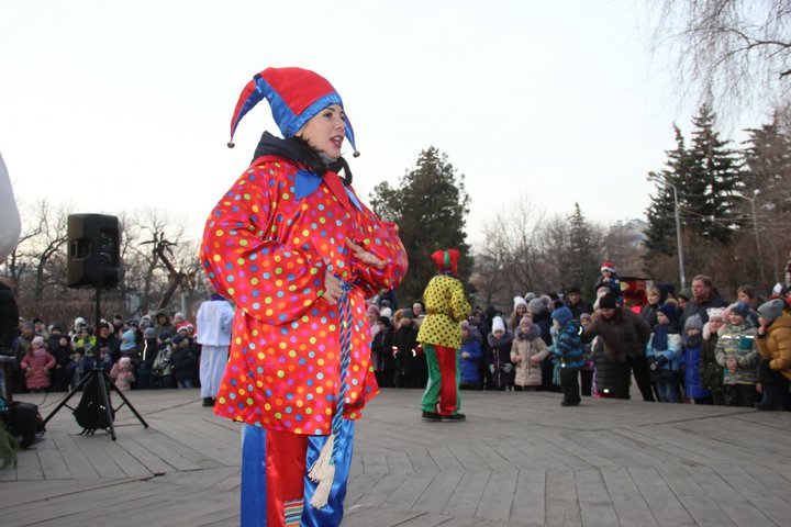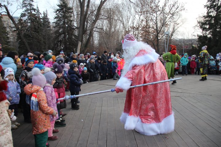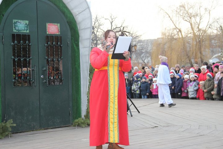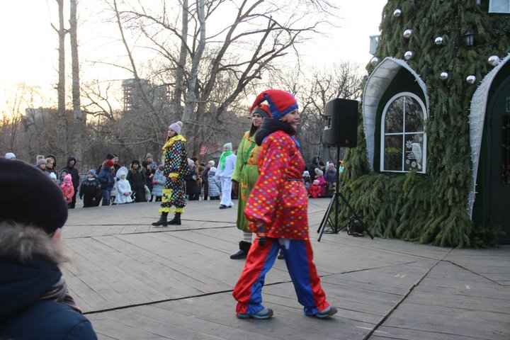 Новогоднее представление началось с выступления скоморох, Снегурочки и других сказочных героев. До появления Деда Мороза на сцене детей развлекали танцами, кричалками и загадками. Через некоторое время в карете к зрителям приехал Дед Мороз. Дети тут же направились к нему обниматься и фотографироваться. Поднявшись на сцену, зимний волшебник поприветствовал всех собравшихся. Скоморохи попросили рассказать его, где он был и что видел. Волшебник сообщил, что бывал и на Северном и на Южном полюсе, однако Октябрьский район ему нравится больше, поэтому он так торопился сюда.