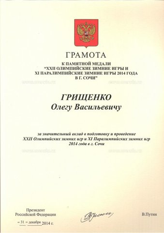 Президент России Владимир Путин наградил главу Саратова Олега Грищенко памятной медалью "XXII Олимпийские зимние игры и XI Паралимпийские зимние игры 2014 года в Сочи". Градоначальника поощрили "за значительный вклад в подготовку и проведение игр". Медаль сопровождается грамотой, подписанной российским лидером.