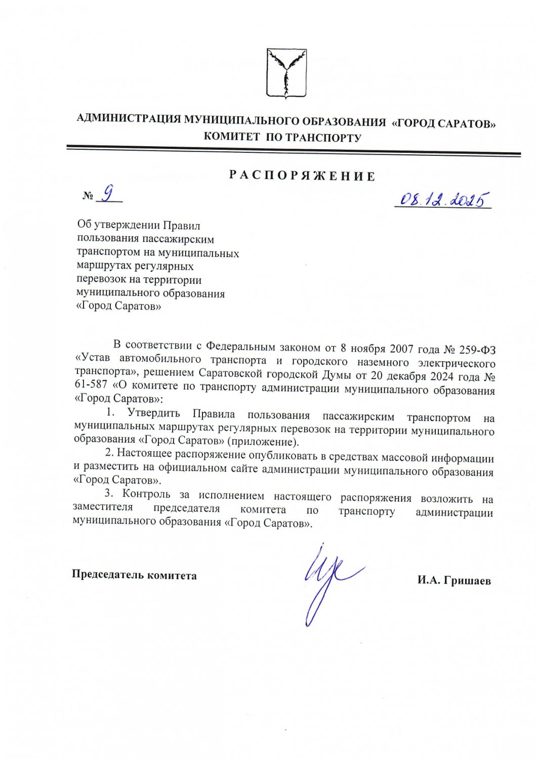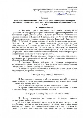 В Саратове утверждены правила пользования пассажирским транспортом на муниципальных маршрутах регулярных перевозок. Распоряжение подписал председатель комитета по транспорту мэрии Игорь Гришаев.