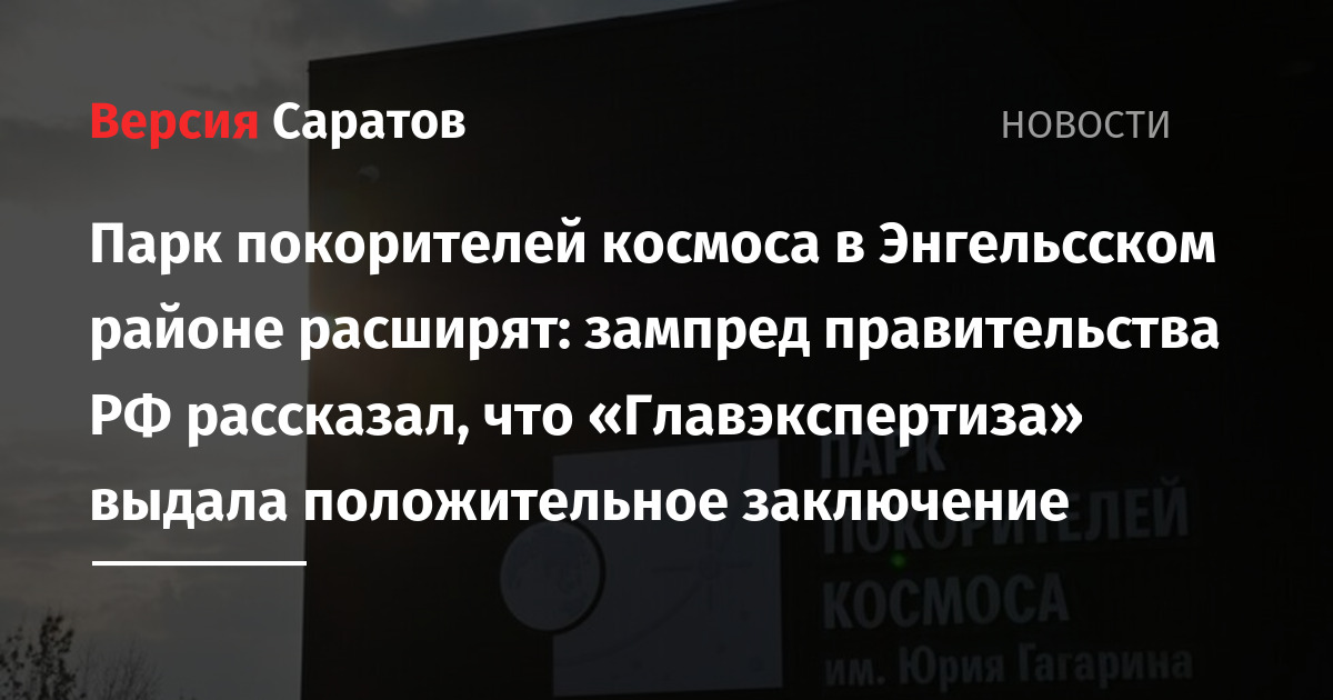 «Главгосэкспертиза России» выдала положительное заключение на строительство объектов второй очереди на территории Парка покорителей космоса имени Ю. А. Гагарина в Энгельсском районе. Об этом сообщил заместитель председателя Правительства РФ Марат Хуснуллин.